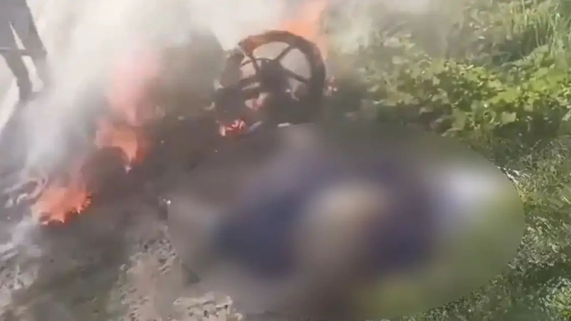 ಆದರೆ ಬೈಕ್ ಬೆಂಕಿಗೆ ಸಂಪೂರ್ಣವಾಗಿ ಆಹುತಿಯಾಗಿದೆ. ಉರಿಯುತ್ತಿರುವ ಮೋಟಾರ್‌ಸೈಕಲ್‌ನ ಪಕ್ಕದಲ್ಲಿ ದಂಪತಿ ಶವ ಬಿದ್ದಿದ್ದು ಬೆಂಕಿಯಲ್ಲಿ ಹೊತ್ತಿ ಉರಿದಿದೆ. ಈ ಭಯಾನಕ ದೃಶ್ಯ ಬೆಚ್ಚಿ ಬೀಳಿಸಿದೆ.