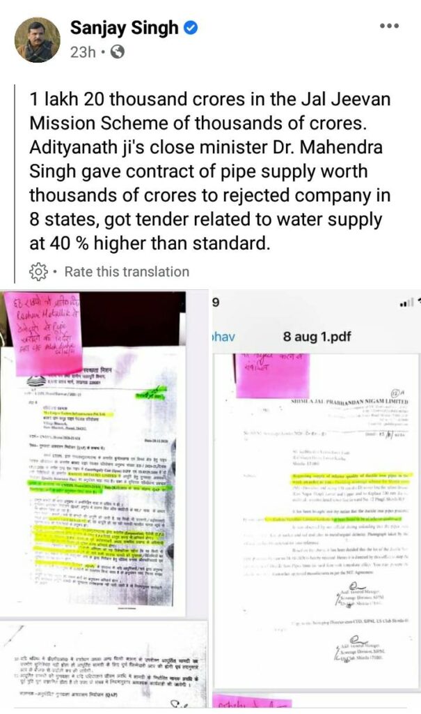 ಕೇಂದ್ರ ಸರ್ಕಾರದ ಮಹತ್ವಾಕಾಂಕ್ಷಿ ಯೋಜನೆಯಾಗಿರುವ ಜಲ್ ಜೀವನ್ ಮಿಷನ್ ಯೋಜನೆಯಲ್ಲಿ ಹಗರಣ ನಡೆದಿರುವ ಕುರಿತು ಆರೋಪಗಳು ಕೇಳಿ ಬಂದಿವೆ. ಸಂಜಯ್ ಸಿಂಗ್ ಅವರ ಪ್ರಕಾರ ಯೋಜನೆಯ ಪೈಪ್ ಲೈನ್ ಕಾಮಗಾರಿಯ ಗುತ್ತಿಗೆಯನ್ನು ಬಿಜೆಪಿ ಸಚಿವರಾಗಿರುವ ಡಾ. ಮಹೇಂದ್ರ ಸಿಂಗ್ ಅವರ ಕಂಪನಿಗೆ ನೀಡಲಾಗಿದೆ. ಈ ಕಂಪೆನಿಯನ್ನು ಎಂಟು ರಾಜ್ಯಗಳು ಕಳಪೆ ಕಾಮಗಾರಿಗಾಗಿ ತಿರಸ್ಕರಿಸಿವೆ. ಈ ಕಂಪನಿಯ ಹೆಸರನ್ನು ಕಪ್ಪು ಪಟ್ಟಿಗೆ ಸೇರಿಸಿವೆ. ಇಂತಹ ಕಂಪನಿಗೆ, ಮೂಲ ಅಂದಾಜು ಬೆಲೆಗಿಂತ 40% ಹೆಚ್ಚಿನ ದರಕ್ಕೆ ಟೆಂಡರ್ ನೀಡಲಾಗಿದೆ.
