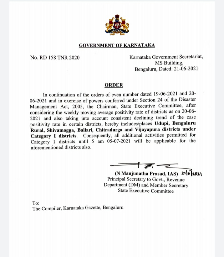 ಇವತ್ತಿನಿಂದ ಅಂದರೆ ಸೋಮವಾರದಿಂದ ಅನ್ ಲಾಕ್ ಒಳಪಡುವ 16 ಜಿಲ್ಲೆಗಳ ಜೊತೆ ಬೆಂಗಳೂರು ಗ್ರಾಮಾಂತರ, ಉಡುಪಿ, ಶಿವಮೊಗ್ಗ, ಬಳ್ಳಾರಿ ವಿಜಯಪುರ ಮತ್ತು ಚಿತ್ರದುರ್ಗ ಜಿಲ್ಲೆಗಳಲ್ಲಿ 19/06/2021ರಲ್ಲಿ ಆದೇಶಿಸಿರುವ ಆನ್ ಲಾಕ್ ಅನ್ವಯವಾಗುವಂತೆ ಸಡಿಲಿಕೆ ಮಾಡಲಾಗಿದೆ ಎಂದು ಸರ್ಕಾರಿ ಆದೇಶದಲ್ಲಿ ತಿಳಿಸಲಾಗಿದೆ.