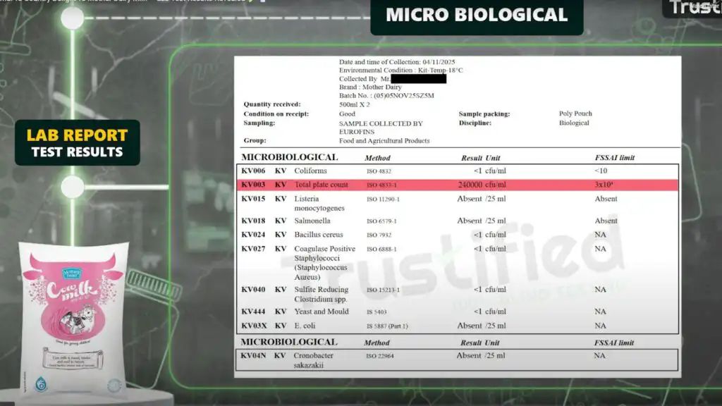 ಮದರ್ ಡೈರಿ ಹಸುವಿನ ಹಾಲು TPC ಯಲ್ಲಿ 2,40,000 CFU/ml ಅನ್ನು ದಾಖಲಿಸುವಲ್ಲಿ ವಿಫಲವಾಗಿದೆ, ಇದು ಟ್ರಸ್ಟಿಫೈಡ್ ಪ್ರಕಾರ, ನಿಗದಿತ ಮಿತಿ (FSSAI) 30,000 CFU/ml ಗಿಂತ ಸುಮಾರು ಎಂಟು ಪಟ್ಟು ಹೆಚ್ಚಾಗಿದೆ.