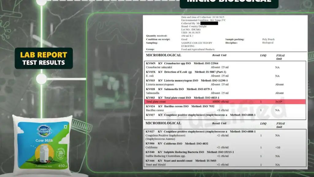 ಕಂಟ್ರಿ ಡಿಲೈಟ್ ಹಸುವಿನ ಹಾಲು, TPC ಮಟ್ಟಗಳು ಸುರಕ್ಷತಾ ಮಿತಿಯಾದ 30,000 CFU/ml ಗೆ ಹೋಲಿಸಿದರೆ ಎರಡು ಪಟ್ಟು ಹೆಚ್ಚು, 60,000 CFU/ml ಎಂದು ಕಂಡುಬಂದಿದೆ.