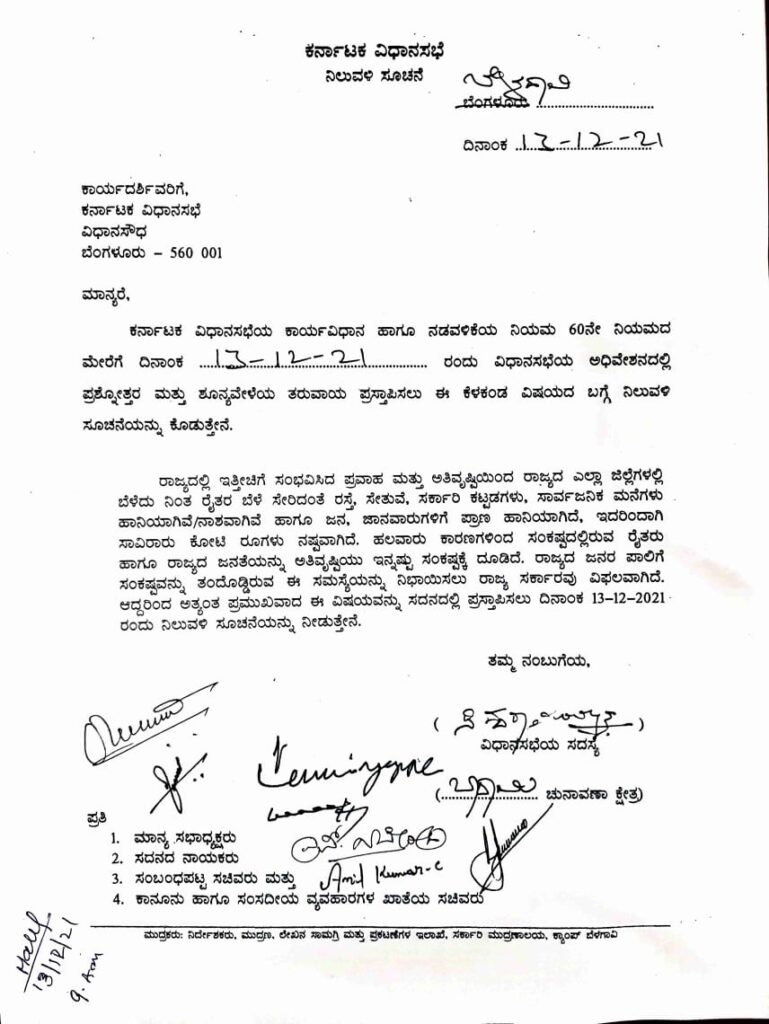 ಅಧಿವೇಶನದಲ್ಲಿ ಪ್ರಶ್ನೋತ್ತರ ಮತ್ತು ಶೂನ್ಯವೇಲೆಯ ತರುವಾಯ ಪ್ರಸ್ತಾಪಿಸಲು ನಿಲುವಳಿ ಸೂಚಿಸಿದ ಸಿದ್ದರಾಮಯ್ಯ –
