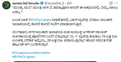 “ಮಂಥ್ಲಿ ಮನಿ” ಮಂತ್ರಿ ಆರ್.ಬಿ.ತಿಮ್ಮಾಪೂರ ಅವರೇ ಈ ಅಕ್ರಮದಲ್ಲಿ ನಿಮ್ಮ ಪಾಲು ಎಷ್ಟು ? ಲಂಚ ಬಾಕ ಕಾಂಗ್ರೆಸ್‌ ಸರ್ಕಾರದ ಆಡಳಿತದಲ್ಲಿ ಬಾರ್‌ ಲೈಸೆನ್ಸ್‌ ನೀಡಲು ಅಬಕಾರಿ ಇಲಾಖೆಯಲ್ಲಿ ಕೋಟಿ ಕೋಟಿ ಸುಲಿಗೆ ಮಾಡಲಾಗುತ್ತಿದೆ ಎಂದು ರಾಜ್ಯ ಜೆಡಿಎಸ್‌ ಆರೋಪಿಸಿದೆ.