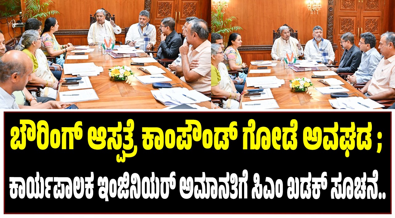 ಬೆಂಗಳೂರು : ಬೌರಿಂಗ್ ಆಸ್ಪತ್ರೆ ಕಾಂಪೌಂಡ್ ಗೋಡೆ ಕುಸಿದು ಏಳು ಜನರ ಸಾವಿಗೆ ಕಾರಣವಾಗಿರುವ ಹಿನ್ನೆಲೆಯಲ್ಲಿ ಸಂಬಂಧಪಟ್ಟ ಕಾರ್ಯಪಾಲಕ ಇಂಜಿನಿಯರ್ ಅವರನ್ನು ಅಮಾನತುಗೊಳಿಸಿ, ನೋಟೀಸು ನೀಡುವಂತೆ ಮುಖ್ಯಮಂತ್ರಿ ಸಿದ್ದರಾಮಯ್ಯ ಸೂಚಿಸಿದ್ದಾರೆ.