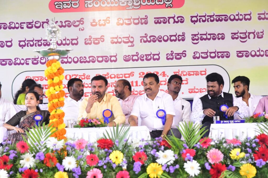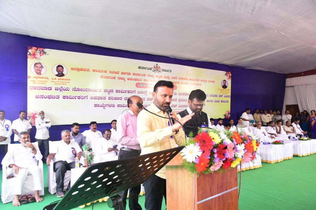 ಗೋಕುಲ ರಸ್ತೆಯ ಗೋಕುಲ ಗಾರ್ಡನ್ನಲ್ಲಿ ಜಿಲ್ಲಾಡಳಿತ, ಕಾರ್ಮಿಕ ಇಲಾಖೆ, ಕರ್ನಾಟಕ ರಾಜ್ಯ ಕಟ್ಟಡ ಮತ್ತು ಇತರೆ ನಿರ್ಮಾಣ ಕಾರ್ಮಿಕರ ಕಲ್ಯಾಣ ಮಂಡಳಿ ಹಾಗೂ ಕರ್ನಾಟಕ ರಾಜ್ಯ ಅಸಂಘಟಿತ ಕಾರ್ಮಿಕರ ಸಾಮಾಜಿಕ ಭದ್ರತಾ ಮಂಡಳಿ ಇವುಗಳ ಸಂಯುಕ್ತಾಶ್ರಯದಲ್ಲಿ ಆಯೋಜಿಸಿದ್ದ ಧಾರವಾಡ ಜಿಲ್ಲೆಯ ನೋಂದಾಯಿತ ಕಟ್ಟಡ ಕಾರ್ಮಿಕರಿಗೆ ಟೂಲ್ಸ್ ಕಿಟ್ ವಿತರಣೆ, ಧನ ಸಹಾಯದ ಮಂಜೂರಾತಿ ಆದೇಶದ ಚೆಕ್ ವಿತರಣೆ, ಅಸಂಘಟಿತ ಕಾರ್ಮಿಕರಿಗೆ ಅಪಘಾತ ಪರಿಹಾರ ಧನ ಸಹಾಯದ ಚೆಕ್ ಮತ್ತು ನೋಂದಣಿ ಪ್ರಮಾಣ ಪತ್ರಗಳ ವಿತರಣೆ ಹಾಗೂ ವಿವಿಧ ಕಾರ್ಮಿಕ ಕಾಯ್ದೆಗಳಡಿ ಕಾರ್ಮಿಕರಿಗೆ ಮಂಜೂರಾದ ಆದೇಶದ ಚೆಕ್ ವಿತರಣೆ ಕಾರ್ಯಕ್ರಮವನ್ನು ಉದ್ಘಾಟಿಸಿ ಅವರು ಮಾತನಾಡಿದರು.