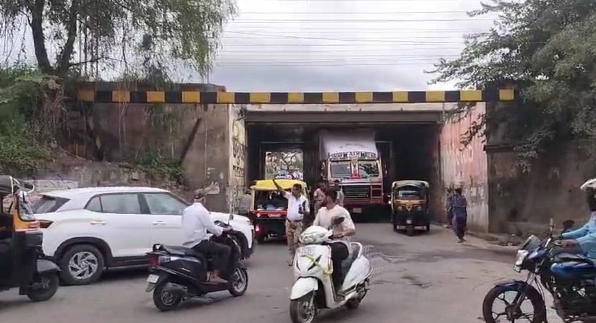 ರೈಲ್ವೆ ಅಂಡರ್ ಬ್ರಿಡ್ಜ್ ಮಧ್ಯದಲ್ಲಿ ಬಂದು ಸಿಲುಕಿದ ಲಾರಿ