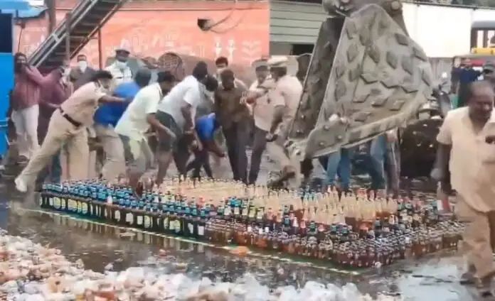 ಆಂಧ್ರಪ್ರದೇಶ :ಪೊಲೀಸರು ವಶಪಡಿಸಿಕೊಂಡ ಅಕ್ರಮ ಮದ್ಯವನ್ನು ಧ್ವಂಸ ಮಾಡುತ್ತಿದ್ದ ವೇಳೆ ಮದ್ಯದ ಬಾಟಲಿಗಳನ್ನು ತೆಗೆದುಕೊಂಡು ಹೋಗಲು ಕುಡುಕರು ಮುಗಿಬಿದ್ದ ಘಟನೆ ಗುಂಟೂರಿನಲ್ಲಿ ನಡೆದಿದೆ.