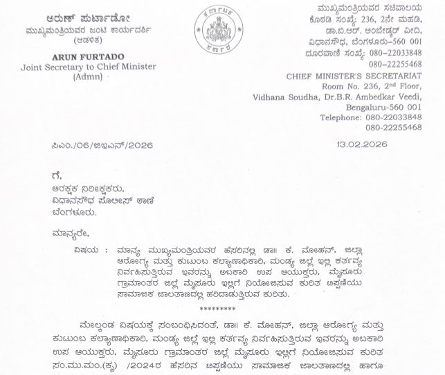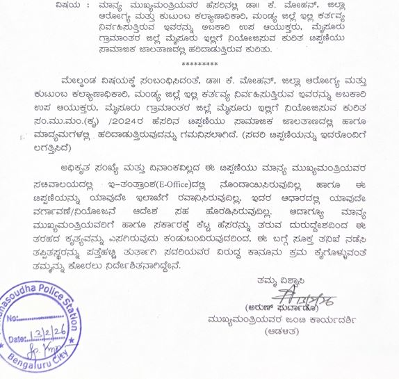 ಡಾ। ಕೆ. ಮೋಹನ್, ಜಿಲ್ಲಾ ಆರೋಗ್ಯ ಮತ್ತು ಕುಟುಂಬ ಕಲ್ಯಾಣಾಧಿಕಾರಿ, ಮಂಡ್ಯ ಜಿಲ್ಲೆ ಇಲ್ಲಿ ಕರ್ತವ್ಯ ನಿರ್ವಹಿಸುತ್ತಿರುವ ಇವರನ್ನು ಅಬಕಾರಿ ಉಪ ಆಯುಕ್ತರು, ಮೈಸೂರು ಗ್ರಾಮಾಂತರ ಜಿಲ್ಲೆ ಮೈಸೂರು ಇಲ್ಲಿಗೆ ನಿಯೋಜಿಸುವ ಕುರಿತ ಸಂ.ಮು.ಮಂ.(ಕೃ) /2024ರ ಹೆಸರಿನ ಟಿಪ್ಪಣಿಯು ಸಾಮಾಜಿಕ ಜಾಲತಾಣದಲ್ಲಿ ಹಾಗೂ ಮಾದ್ಯಮಗಳಲ್ಲಿ ಹರಿದಾಡುತ್ತಿರುವುದನ್ನು ಗಮನಿಸಲಾಗಿದೆ. (ಸದರಿ ಟಿಪ್ಪಣಿಯನ್ನು ಇದರೊಂದಿಗೆ ಲಗತ್ತಿಸಿದೆ) ಹಾಗೂ ಅಧಿಕೃತ ಸಂಖ್ಯೆ ಮತ್ತು ದಿನಾಂಕವಿಲ್ಲದ ಈ ಟಿಪ್ಪಣಿಯು ಮಾನ್ಯ ಮುಖ್ಯಮಂತ್ರಿಯವರ ಸಚಿವಾಲಯದಲ್ಲಿ ಇ-ತಂತ್ರಾಂಶ(E-Office)ದಲ್ಲಿ ನೊಂದಾಯಿಸಿರುವುದಿಲ್ಲ ಟಿಪ್ಪಣಿಯನ್ನು ಯಾವುದೇ ಇಲಾಖೆಗೆ ರವಾನಿಸಿರುವುದಿಲ್ಲ ಎಂದು ದೂರಿನಲ್ಲಿ ಸ್ಪಷ್ಟನೆ ನೀಡಿದ್ದಾರೆ.