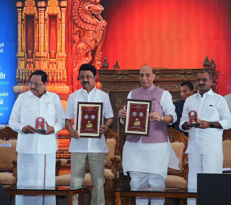 ಚೆನ್ನೈ (ತಮಿಳುನಾಡು): ತಮಿಳುನಾಡು ಮಾಜಿ ಮುಖ್ಯಮಂತ್ರಿ ಎಂ ಕರುಣಾನಿಧಿ ಅವರ ಶತಮಾನೋತ್ಸವದ ನೆನಪಿನ 100 ರೂಪಾಯಿ ನಾಣ್ಯವನ್ನು ರಕ್ಷಣಾ ಸಚಿವ ರಾಜನಾಥ್ ಸಿಂಗ್ ಭಾನುವಾರ ಇಲ್ಲಿನ ಕಲೈವಾನರ್ ಅರೆನಾದಲ್ಲಿ ಬಿಡುಗಡೆ ಮಾಡಿದರು. ನಾಣ್ಯವನ್ನು ತಮಿಳುನಾಡು ಮುಖ್ಯಮಂತ್ರಿ ಎಂ.ಕೆ.ಸ್ಟಾಲಿನ್ ಸ್ವೀಕರಿಸಿದರು. ಇದಾದ ಬಳಿಕ ಬಿಜೆಪಿಯ ಮಾಜಿ ಅಧ್ಯಕ್ಷ ರಾಜನಾಥ್, ಸಿಎಂ ಸ್ಟಾಲಿನ್ ಕೂಡ ತಮಿಳುನಾಡು ಮತ್ತು ಭಾರತಕ್ಕೆ ಕರುಣಾನಿಧಿ ನೀಡಿದ ಕೊಡುಗೆಯ ಬಗ್ಗೆ ಮಾತನಾಡಿದರು.
