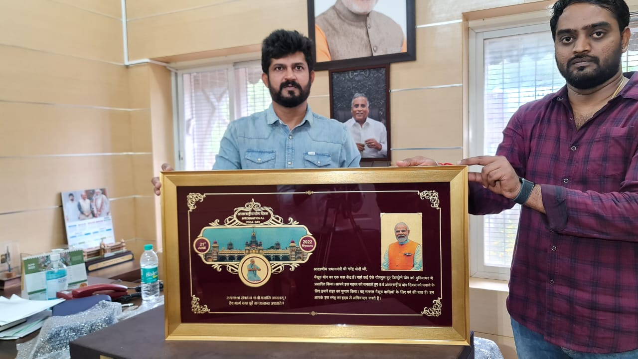 ಸ್ವರ್ಣ ಲೇಪಿತ ಅಕ್ಷರದ ಫೋಟೋಮೈಸೂರು ಅರಮನೆ, ಮೋದಿ ಯೋಗದ ಭಂಗಿ ಹಾಗೂ ಪ್ರಧಾನಿ ಭಾವಚಿತ್ರವನ್ನು ಬಂಗಾರದಿಂದ ಕೆತ್ತನೆ ಮಾಡಲಾಗಿದೆ. ಬಂಗಾರ ಲೇಪಿತ ಕೆತ್ತನೆಯ ಚಿತ್ರಪಟದಲ್ಲಿ ಯೋಗದ ಶ್ಲೋಕವನ್ನ ಅಳವಡಿಕೆ ಮಾಡಲಾಗಿದೆ. ಥಾಯ್ಲೆಂಡ್​​​ನಲ್ಲಿ ಮಾಡಿಸಲಾಗಿರುವ ವಿಶೇಷ ಗಿಫ್ಟ್​ ಇದಾಗಿದ್ದು, ಮೈಸೂರಿಗರ ಪರವಾಗಿ ಯೋಗಕ್ಕೆ ಮೈಸೂರನ್ನ ಆಯ್ಕೆ ಮಾಡಿಕೊಂಡಿದ್ದಕ್ಕಾಗಿ ಚಿನ್ನದ ಅಕ್ಷರಗಳಲ್ಲಿ ಕೃತಜ್ಞತೆ ಸಲ್ಲಿಸಲಾಗುತ್ತಿದೆ ಎಂದು ಸಂಸ್ಥೆಯ ಮುಖ್ಯಸ್ಥರು ಹೇಳಿದ್ದಾರೆ.