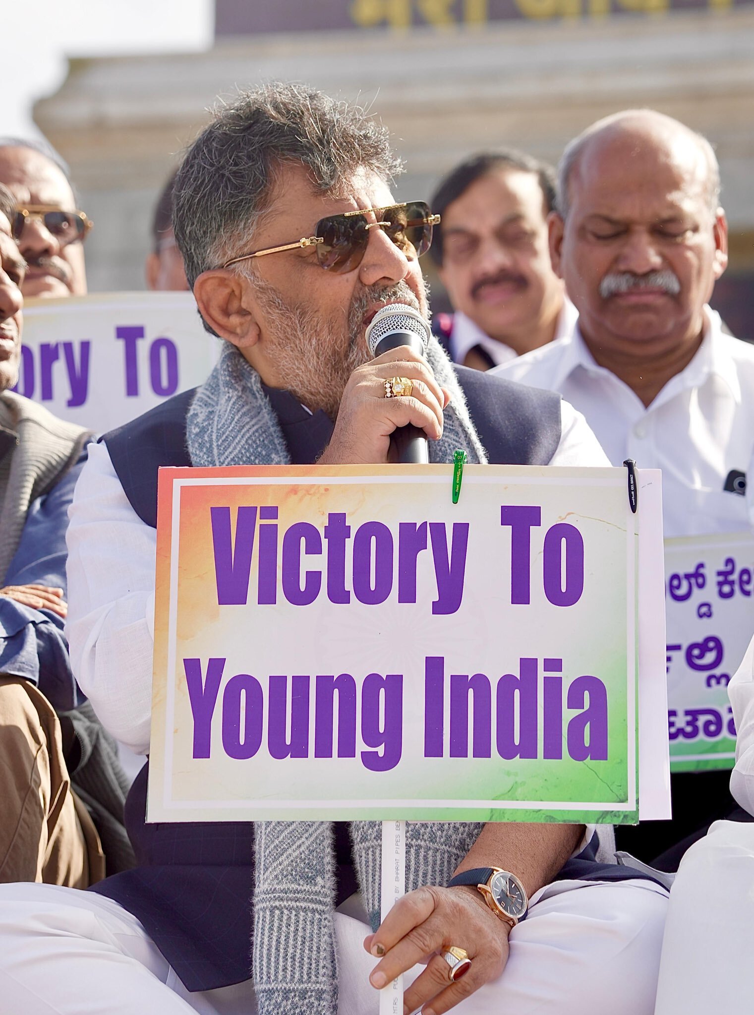 ಬೆಳಗಾವಿ ಸುವರ್ಣ ವಿಧಾನಸೌಧದ ಆವರಣದಲ್ಲಿ ಬುಧವಾರ ನಡೆದ ಧರಣಿಯಲ್ಲಿ ಹಾಗೂ ನಂತರ ಮಾಧ್ಯಮಗಳ ಜೊತೆ ಕೆಪಿಸಿಸಿ ಅಧ್ಯಕ್ಷರೂ ಆದ ಶಿವಕುಮಾರ್ ಅವರು ಮಾತನಾಡಿದರು. “Justice for Congress, Face loss for BJP. End of BJP Conspiracy, Victory for Democracy. ಬಿಜೆಪಿ ಎಷ್ಟೇ ಪಿತೂರಿ ಮಾಡಿದರೂ ನಮಗೆ ನ್ಯಾಯ ಸಿಕ್ಕಿದೆ.
