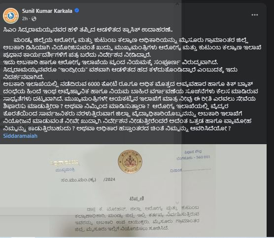 ಸಿಎಂ ಸಿದ್ದರಾಮಯ್ಯನವರ ಹಳಿ ತಪ್ಪಿದ ಆಡಳಿತದ ಕ್ಲಾಸಿಕ್ ಉದಾಹರಣೆ. ಮಂಡ್ಯ ಜಿಲ್ಲೆಯ ಆರೋಗ್ಯ ಮತ್ತು ಕುಟುಂಬ ಕಲ್ಯಾಣ ಅಧಿಕಾರಿಯನ್ನು ಮೈಸೂರು ಗ್ರಾಮಾಂತರ ಜಿಲ್ಲೆ ಅಬಕಾರಿ ಡಿಸಿಯಾಗಿ ನಿಯೋಜಿಸುವಂತೆ ಖುದ್ದು ಮುಖ್ಯಮಂತ್ರಿಗಳು ಆರೋಗ್ಯ ಮತ್ತು ಕುಟುಂಬ ಕಲ್ಯಾಣ ಇಲಾಖೆ ಪ್ರಧಾನ ಕಾರ್ಯದರ್ಶಿಗಳಿಗೆ ಪತ್ರ ಬರೆದು ನಿರ್ದೇಶನ ನೀಡಿದ್ದಾರೆ ಎಂದು ಆರೋಪಿಸಿದ್ದಾರೆ.