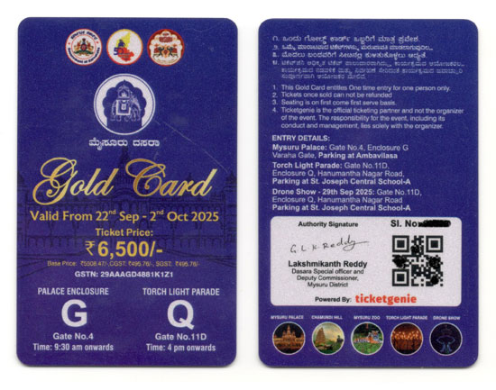 2025 ರ ದಸರಾ ಸಂಭ್ರಮವನ್ನು ನೋಡಲು Gold ಪಾಸ್‌ ಒಬ್ಬರಿಗೆ ರೂ 6,500 ನಿಗದಿ ಪಡೆಸಲಾಗಿತ್ತು.ಈ ಪಾಸ್‌ ನಲ್ಲಿ ವಿಶ್ವ ವಿಖ್ಯಾತ ದಸರಾ procession ಅದರಲ್ಲೂ ಜಂಬೂ ಸವಾರಿ ಹಾಗೂ ಅದೇ ದಿನ ಸಂಜೆ ನಡೆಯುವ Torch Light Parade ನೋಡ ಬಹದು. ಇನ್ನು ಪ್ರತ್ಯೇಕ ಕಾರ್ಯಕ್ರಮಗಳನ್ನು ವೀಕ್ಷಣೆಗೆ 3,500 ರೂ ಟಿಕಟ್‌ ನಿಗದಿಯಾಗಿದ್ದು, ಈ ಟಿಕೆಟ್‌ ನಲ್ಲಿ ಕೇವಲ ಜಂಬೂ ಸವಾರಿ ಮೆರವಣಿಗೆಯನ್ನು ಮಾತ್ರ ನೋಡಬಹದಾಗಿದೆ.