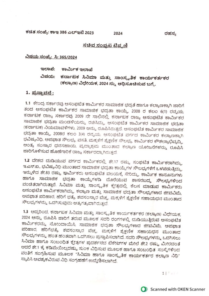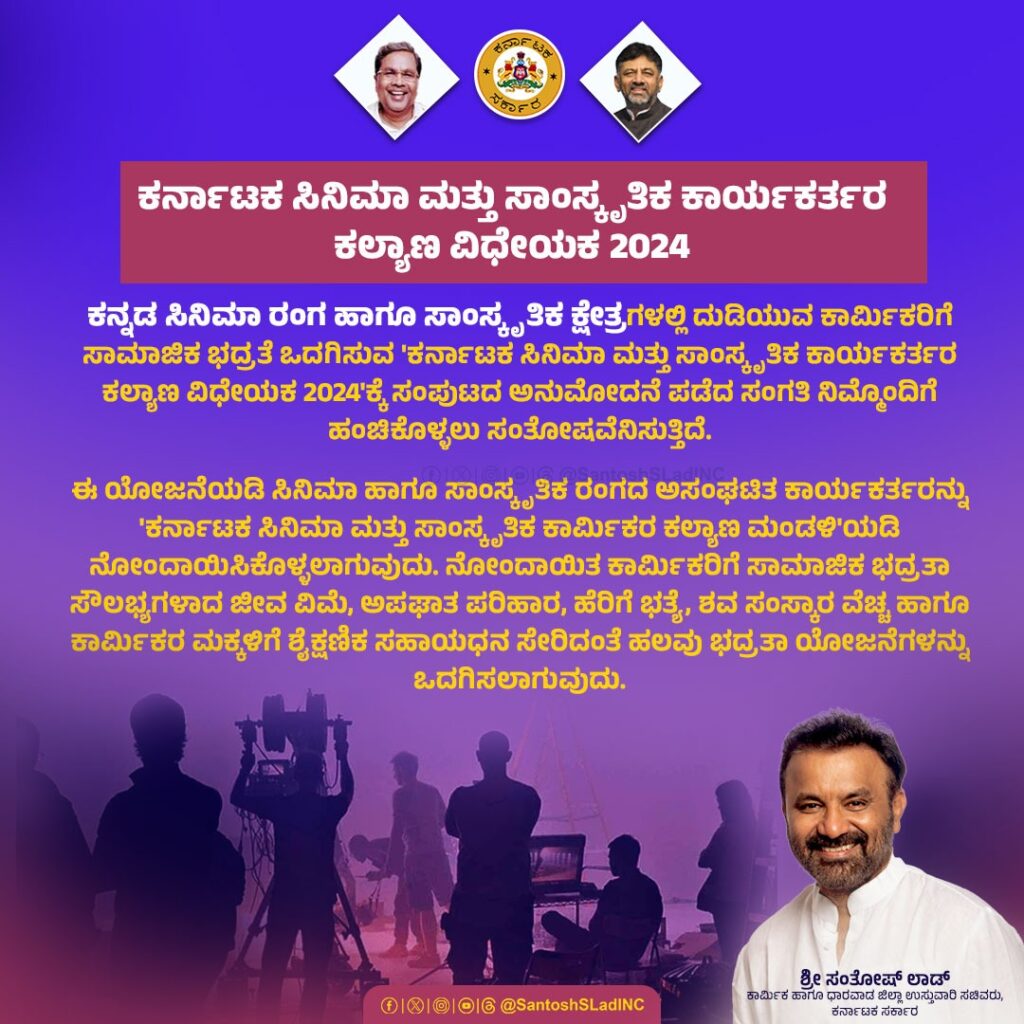 ಸಿನಿಮಾ ಮತ್ತು ಸಾಂಸ್ಕೃತಿಕ ಕ್ಷೇತ್ರದಲ್ಲಿ ಕೆಲಸ ಮಾಡುವ ಕಾರ್ಮಿಕರ ಕಲ್ಯಾಣಕ್ಕಾಗಿ ಕರ್ನಾಟಕ ಸಿನಿಮಾ ಮತ್ತು ಸಾಂಸ್ಕೃತಿಕ ಕಾರ್ಯಕರ್ತಕರ (ಕಲ್ಯಾಣ) ವಿಧೇಯಕ, 2024 ನ್ನು ರೂಪಿಸಿ ಜಾರಿಗೆ ತರಲು ಸಂಪುಟ ಸಭೆಯಲ್ಲಿ ಅನುಮೋದನೆ ಪಡೆಯಲಾಗಿದ್ದು, ವಿಧಾನ ಮಂಡಲದಲ್ಲಿ ಸಹ ಅಂಗೀಕಾರ ಪಡೆಯಲಾಗುವುದು ಎಂದು ಕಾರ್ಮಿಕ ಸಚಿವ ಸಂತೋಷ್ ಲಾಡ್ ತಿಳಿಸಿದರು.