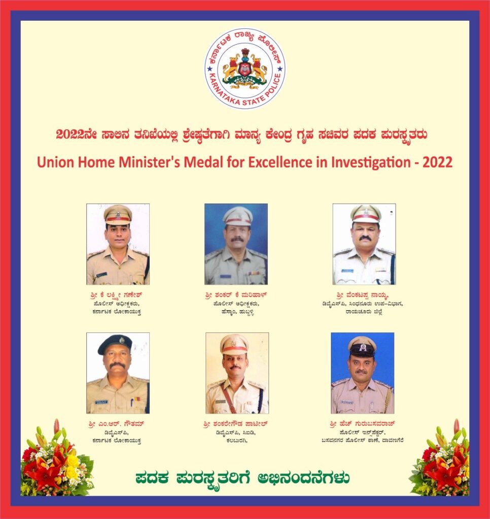 ಕೊಲೆ, ಡ್ರಗ್ಸ್ ಮಾರಾಟ, ಕಳ್ಳತನ ಸೇರಿದಂತೆ ಇತರೆ ಗಂಭೀರ ಪ್ರಕರನಗಳನ್ನು ಬೇಧಿಸಿ ಅಪರಾಧಿಗಳಿಗೆ ಶಿಕ್ಷೆ ಕೊಡಿಸಿದ ರಾಜ್ಯದ ಆರು ಪೊಲೀಸ್ ಅಧಿಕಾರಿಗಳಿಗೆ 2022ರ ಕೇಂದ್ರ ಗೃಹ ಸಚಿವಾಲಯದ ಪದಕ ಲಭಿಸಿದೆ.