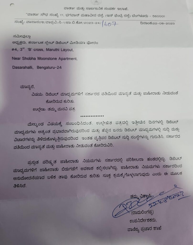 ಹಾಗೂ ಡಿಜಿಟಲ್ ಮಾಧ್ಯಮಗಳ ವೃತ್ತಿಪರ ಪತ್ರಕರ್ತರ ಉಳಿವಿಗಾಗಿ ಟಿವಿ ಹಾಗೂ ಪತ್ರಿಕೆಗಳ ಮಾದರಿಯಲ್ಲೇ ಡಿಜಿಟಲ್ ಮಾಧ್ಯಮಗಳಿಗೆ ಜಾಹೀರಾತು ಪಡೆಯುವ ಮೂಲ ಉದ್ದೇಶದಿಂದ ಕರ್ನಾಟಕ ಸ್ಟೇಟ್ ಡಿಜಿಟಲ್ ಮೀಡಿಯಾ ಫೋರಂ ಸ್ಥಾಪಿಸಲಾಗಿತ್ತು. 24-08-2022 ರಲ್ಲಿ ಕರ್ನಾಟಕ ಸಂಘಗಳ ನೋಂದಣಿ ಕಾಯ್ದೆ ಅಡಿಯಲ್ಲಿ ಸ್ಥಾಪಿತವಾದ ಸಂಸ್ಥೆ ಈ ದಿಸೆಯಲ್ಲಿ ಸಾಕಷ್ಟು ಶ್ರಮ ಹಾಕಿದೆ. 10-06-2023 ರಲ್ಲಿ ಮುಖ್ಯಮಂತ್ರಿ ಸಿದ್ದರಾಮಯ್ಯ ಹಾಗೂ ಉಪಮುಖ್ಯಮಂತ್ರಿ ಡಿಕೆ ಶಿವಕುಮಾರ್ ಸೇರಿದಂತೆ ವಾರ್ತಾ ಇಲಾಖೆಯ ಆಯುಕ್ತರಿಗೆ ಡಿಜಿಟಲ್ ಮಾಧ್ಯಮಗಳ ಮಾನ್ಯತೆ & ಜಾಹೀರಾತು ನೀಡುವ ಕುರಿತು ಮನವಿ ಮಾಡಲಾಗಿತ್ತು. 22-08-2023 ರಂದು ನಮ್ಮ ಮನವಿಗೆ ಪತ್ರದ ಮೂಲಕ ಉತ್ತರಿಸಿದ್ದ ವಾರ್ತಾ & ಸಾರ್ವಜನಿಕ ಸಂಪರ್ಕ ಇಲಾಖೆಯ ಉಪ ನಿರ್ದೇಶಕ ರಾಮಲಿಂಗಪ್ಪ ನಿಮ್ಮ ಬೇಡಿಕೆ ಪರಿಶೀಲನೆ ಹಂತದಲ್ಲಿದ್ದು ಅನುಮೋದನೆಯಾದ ಬಳಿಕ ಸೂಕ್ತ ಕ್ರಮ ಕೈಗೊಳ್ಳುವುದಾಗಿ ತಿಳಿಸಿದ್ರು.