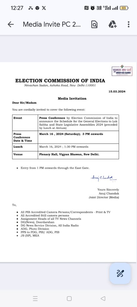 ಈ ಬಗ್ಗೆ ಸಾಮಾಜಿಕ ಜಾಲತಾಣ ಎಕ್ಸ್ ಖಾತೆಯಲ್ಲಿ, ನಾಳೆ ಅಂದರೆ ಮಾರ್ಚ್ 16 ರಂದು ಮಧ್ಯಾಹ್ನ 3 ಗಂಟೆಗೆ ಸುದ್ದಿಗೋಷ್ಠಿ ನಡೆಸಿ ವೇಳಾಪಟ್ಟಿ ಪ್ರಕಟಿಸಲಾಗುತ್ತದೆ ಎಂದು ಚುನಾವಣಾ ಆಯೋಗ