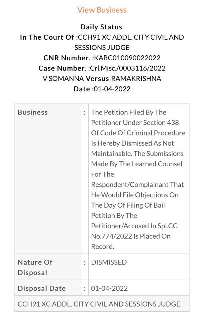 ಸಚಿವ ಸೋಮಣ್ಣ ಅವರ ನಿರೀಕ್ಷಣಾ ಜಾಮೀನು ಮನವಿಯ ವಿಚಾರಣೆಯನ್ನು ಬುಧವಾರ ನಡೆಸಿದ 110ನೇ ಹೆಚ್ಚುವರಿ ಸಿಟಿ ಸಿವಿಲ್ ಮತ್ತು ಸತ್ರ ನ್ಯಾಯಾಲಯ ಹಾಗೂ ಹಾಲಿ ಮತ್ತು ಮಾಜಿ ಶಾಸಕ ಹಾಗೂ ಸಂಸದರ ವಿರುದ್ಧದ ಕ್ರಿಮಿನಲ್ ಪ್ರಕರಣಗಳ ವಿಚಾರಣೆ ನಡೆಸುವುದಕ್ಕಾಗಿ ಸ್ಥಾಪಿಸಲಾಗಿರುವ ವಿಶೇಷ ನ್ಯಾಯಾಲಯದ ನ್ಯಾಯಮೂರ್ತಿ ಬಿ ಜಯಂತ್ ಕುಮಾರ್ ಅವರು ಪಕ್ಷಕಾರರ ವಾದ ಆಲಿಸಿ ಆದೇಶವನ್ನು ಏಪ್ರಿಲ್ ಒಂದಕ್ಕೆ ಕಾಯ್ದಿರಿಸಿದರು. ಆದರೆ ಬಂಧನ ಭೀತಿ ಇಲ್ಲದಿರುವುದರಿಂದ ನಿರೀಕ್ಷಣಾ ಜಾಮೀನು ಕೋರಿರುವ ಮನವಿಯು ನಿರ್ವಹಣೆಗೆ ಅರ್ಹವಾಗಿಲ್ಲ” ಎಂದು ಆಕ್ಷೇಪಿಸಿದರು ಎಂದು ಅರ್ಜಿದಾದರ ವಕೀಲರು ವಾದಿಸಿದ್ದರು.