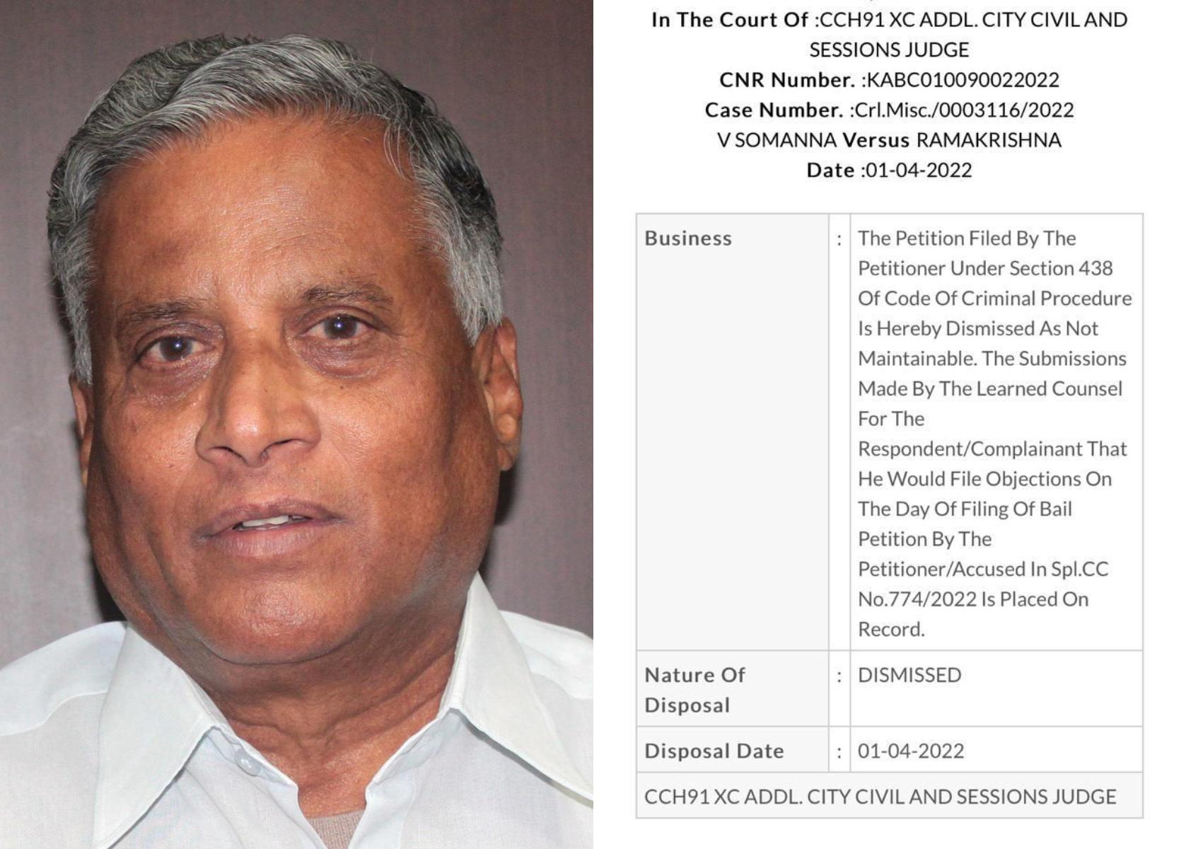 ಸಚಿವ ಸೋಮಣ್ಣ ಅವರ ನಿರೀಕ್ಷಣಾ ಜಾಮೀನು ಮನವಿಯ ವಿಚಾರಣೆಯನ್ನು ಬುಧವಾರ ನಡೆಸಿದ 110ನೇ ಹೆಚ್ಚುವರಿ ಸಿಟಿ ಸಿವಿಲ್ ಮತ್ತು ಸತ್ರ ನ್ಯಾಯಾಲಯ ಹಾಗೂ ಹಾಲಿ ಮತ್ತು ಮಾಜಿ ಶಾಸಕ ಹಾಗೂ ಸಂಸದರ ವಿರುದ್ಧದ ಕ್ರಿಮಿನಲ್ ಪ್ರಕರಣಗಳ ವಿಚಾರಣೆ ನಡೆಸುವುದಕ್ಕಾಗಿ ಸ್ಥಾಪಿಸಲಾಗಿರುವ ವಿಶೇಷ ನ್ಯಾಯಾಲಯದ ನ್ಯಾಯಮೂರ್ತಿ ಬಿ ಜಯಂತ್ ಕುಮಾರ್ ಅವರು ಪಕ್ಷಕಾರರ ವಾದ ಆಲಿಸಿ ಆದೇಶವನ್ನು ಏಪ್ರಿಲ್ ಒಂದಕ್ಕೆ ಕಾಯ್ದಿರಿಸಿದರು. ಆದರೆ ಬಂಧನ ಭೀತಿ ಇಲ್ಲದಿರುವುದರಿಂದ ನಿರೀಕ್ಷಣಾ ಜಾಮೀನು ಕೋರಿರುವ ಮನವಿಯು ನಿರ್ವಹಣೆಗೆ ಅರ್ಹವಾಗಿಲ್ಲ” ಎಂದು ಆಕ್ಷೇಪಿಸಿದರು ಎಂದು ಅರ್ಜಿದಾದರ ವಕೀಲರು ವಾದಿಸಿದ್ದರು.