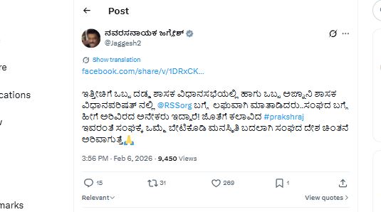 ಆರ್ಎಸ್ಎಸ್(RSS) ಬಗ್ಗೆ ತಪ್ಪು ತಿಳುವಳಿಕೆ ಹೊಂದಿರುವವರು ಒಮ್ಮೆ ಸಂಘಕ್ಕೆ ಭೇಟಿ ನೀಡಬೇಕು ಎಂದು ಜಗ್ಗೇಶ್ ಆಹ್ವಾನ ನೀಡಿದ್ದಾರೆ. ಈ ಸಂದರ್ಭದಲ್ಲಿ ಅವರು ಪ್ರಕಾಶ್ ಬೆಳವಾಡಿ ಅವರ ಹಳೆಯ ವಿಡಿಯೋವೊಂದನ್ನು ಸಾಮಾಜಿಕ ಜಾಲತಾಣದಲ್ಲಿ ಹಂಚಿಕೊಂಡಿದ್ದಾರೆ.