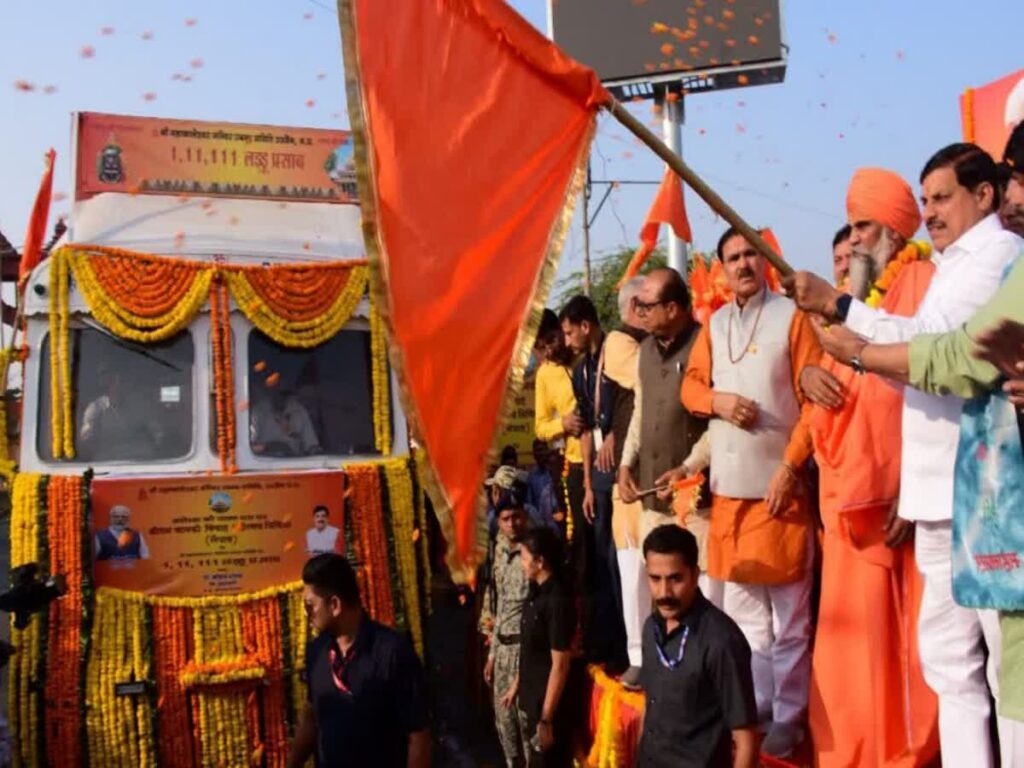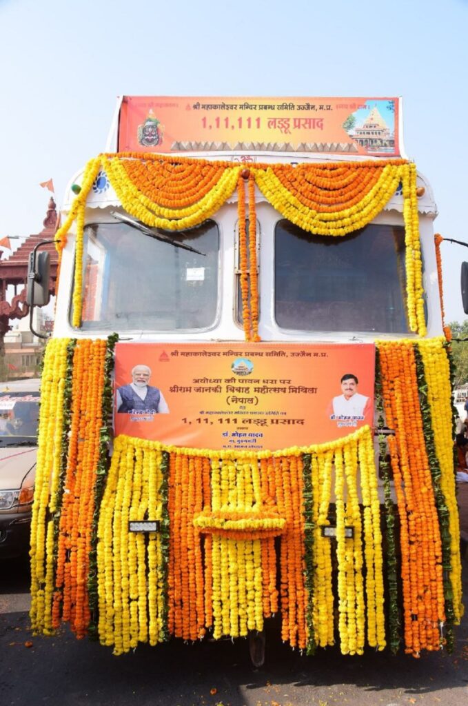ಲಡ್ಡು ತುಂಬಿದ ಟ್ರಕ್ಗೆ ಸಿಎಂ ಮೋಹನ್ ಯಾದವ್ ಧ್ವಜಾರೋಹಣ ನೆರವೇರಿಸಿದರು.ಇಂದೋರ್ ರಸ್ತೆಯಲ್ಲಿರುವ ಮಹಾಮೃತ್ಯುಂಜಯ್ ದ್ವಾರದಿಂದ ಮಹಾಕಾಲ್ ಲಡ್ಡು ತುಂಬಿದ ಟ್ರಕ್ಗೆ ಮುಖ್ಯಮಂತ್ರಿ ಡಾ ಮೋಹನ್ ಯಾದವ್ ಇಂದು ಚಾಲನೆ ನೀಡಿದರು. ಈ ಸಂದರ್ಭದಲ್ಲಿ ಶ್ರೀರಾಮಜೀಯವರ ಮದುವೆಗೆ ಈ ಲಡ್ಡುಗಳನ್ನು ಕಳುಹಿಸಲಾಗುತ್ತಿದೆ ಎಂದರು.