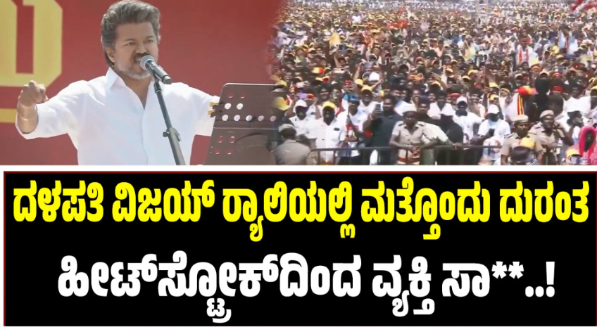 ಸೇಲಂ: ತಮಿಳುನಾಡಿನ ಸೇಲಂನಲ್ಲಿ ನಡೆದ ದಳಪತಿ ವಿಜಯ್ ನೇತೃತ್ವದ ತಮಿಳಗ ವೆಟ್ರಿ ಕಳಗಂ(TVK) ಪಕ್ಷದ ಬೃಹತ್ ಸಮಾವೇಶದಲ್ಲಿ ಮತ್ತೊಂದು ದುರಂತ ಸಂಭವಿಸಿದೆ. ಪಕ್ಷದ ಮುಖ್ಯಸ್ಥ ಹಾಗೂ ನಟ ವಿಜಯ್ ಅವರ ಭಾಷಣ ಕೇಳಲು ಬಂದಿದ್ದ ವ್ಯಕ್ತಿಯೊಬ್ಬರು ವಿಪರೀತ ಬಿಸಿಲಿನ ತಾಪ ತಾಳಲಾರದೆ ಸ್ಥಳದಲ್ಲೇ ಸಾವನ್ನಪ್ಪಿದ್ದಾರೆ ಎಂದು ವರದಿಯಾಗಿದೆ.