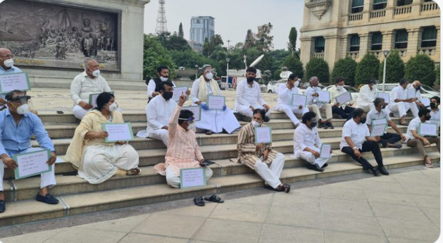 ಕರೋನಾ ಸೋಂಕು ನಿಯಂತ್ರಿಸುವಲ್ಲಿ ಮತ್ತು ಸೋಂಕಿತರ ಪ್ರಾಣ ರಕ್ಷಣೆ ವಿಚಾರದಲ್ಲಿ ನಿರ್ಲಕ್ಸ್ಯ ವಹಿಸಿರುವ ಕೇಂದ್ರ ಮತ್ತು ರಾಜ್ಯ ಸರ್ಕಾರದ ಧೋರಣೆ ಖಂಡಿಸಿ ವಿಕಾಸಸೌಧ ಆವರಣದ ಗಾಂಧಿ ಪ್ರತಿಮೆ ಮುಂಭಾಗ ಕಾಂಗ್ರೆಸ್ ಪಕ್ಷದ ಹಿರಿಯ ನಾಯಕರು ಇಂದು ಸಾಂಕೇತಿವಾಗಿ ಪ್ರತಿಭಟನೆ ನಡೆಸಿದರು.