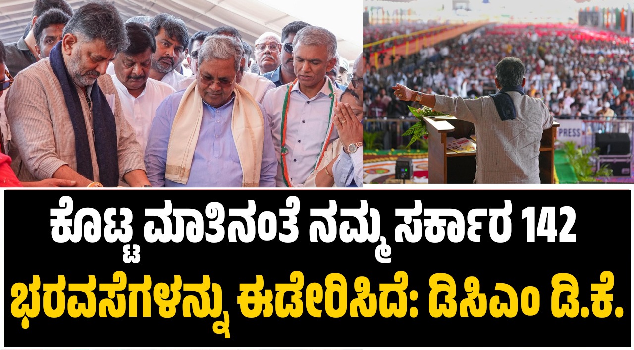 “ನಮ್ಮದು ನುಡಿದಂತೆ ನಡೆವ ಸರ್ಕಾರ. ಕೊಟ್ಟ ಮಾತಿನಂತೆ 142 ಭರವಸೆಗಳನ್ನು ಈಗಾಗಲೇ ಈಡೇರಿಸಿದೆ. ನಮ್ಮ ಸರ್ಕಾರದ ಸಾಧನೆಗಳಿಗೆ ಜನರ ಕಣ್ಣುಗಳೇ ಸಾಕ್ಷಿ” ಎಂದು ಡಿಸಿಎಂ ಡಿ.ಕೆ. ಶಿವಕುಮಾರ್ ಅವರು ತಿಳಿಸಿದರು. ಹಾಸನದಲ್ಲಿ ಶನಿವಾರ ನಡೆದ ಸರ್ಕಾರದ ಸೇವೆಗಳ ಸಮರ್ಪಣಾ ಸಮಾವೇಶದಲ್ಲಿ ಡಿಸಿಎಂ ಡಿ ಕೆ ಶಿವಕುಮಾರ್ ಅವರು ಮಾತನಾಡಿದರು.