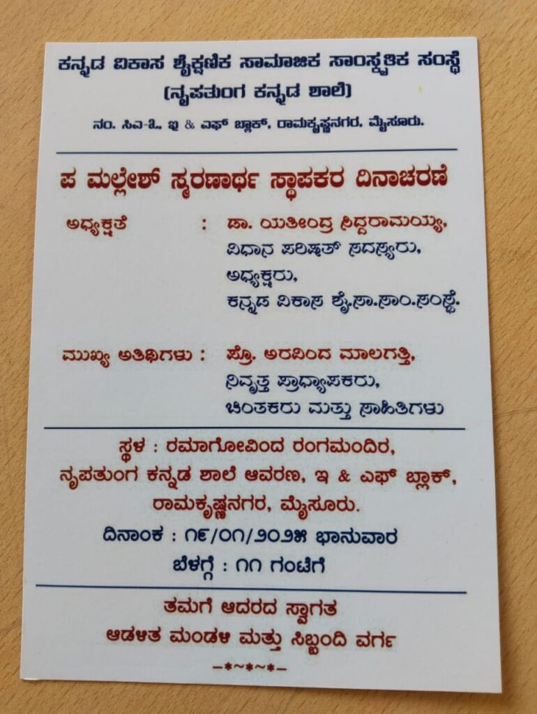 ಕನ್ನಡ ವಿಕಾಸ ಶೈಕ್ಷಣಿಕ ಸಾಮಾಜಿಕ ಸಾಂಸ್ಕೃತಿಕ ಸಂಸ್ಥೆ ( ನೃಪತುಂಗ ಶಾಲೆ) ಕೇವಲ ಶಿಕ್ಷಣ ಮತ್ತು ಬೌದ್ಧಿಕ ಕ್ರಿಯಾಶೀಲತೆಗೆ ಸೀಮಿತವಾಗದೆ, ಬಹುಸಾಂಸ್ಕೃತಿಕ ನೆಲೆಗಳನ್ನು ಮತ್ತಷ್ಟು ವಿಸ್ತರಿಸುವ, ಗಟ್ಟಿಗೊಳಿಸುವ ಮತ್ತು ಬಹುತ್ವಕ್ಕೆ ಎದುರಾಗಿರುವ ಅಪಾಯಗಳನ್ನು ತೊಡೆದುಹಾಕುವ ಒಂದು ಸಾಮಾಜಿಕ ಸಂಸ್ಥೆಯಾಗಿ ರೂಪುಗೊಳ್ಳಬೇಕಿದೆ. ಜನವರಿ 19ರಂದು ನಡೆಯಲಿರುವ ಸಂಸ್ಥಾಪಕ ದಿನಾಚರಣೆ ಇದಕ್ಕೆ ನಾಂದಿ ಆಗಬೇಕಿದೆ. ಈ ನಿಟ್ಟಿನಲ್ಲಿ ಮೈಸೂರಿನ ಸಹೃದಯ ಜನತೆ, ಹೋರಾಟಪರ ಮನಸ್ಸುಗಳು ಮತ್ತು ಜನಪರ ಸಂಘಟನೆಗಳು ಸಕಾರಾತ್ಮಕವಾಗಿ ಸ್ಪಂದಿಸಬೇಕಿದೆ. ತನ್ಮೂಲಕ ನಮ್ಮ ನಡುವೆ ಆರು ದಶಕಗಳಿಗೂ ಹೆಚ್ಚು ಕಾಲ ಸಮಾಜದ ಒಂದು ಭಾಗವಾಗಿ ಬದುಕಿ ನಿರ್ಗಮಿಸಿದ ಪ. ಮಲ್ಲೇಶ್ ಅವರಿಗೆ ನಮ್ಮ ನಮನಗಳನ್ನು ಸಲ್ಲಿಸಬೇಕಿದೆ.