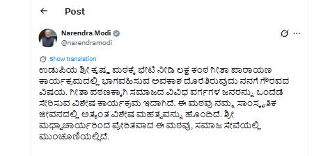 ಇನ್ನು ಉಡುಪಿಯ ಶ್ರೀ ಕೃಷ್ಣ ಮಠಕ್ಕೆ ಭೇಟಿ ನೀಡುತ್ತಿರುವ ಬಗ್ಗೆ ಪ್ರಧಾನಿ ಮೋದಿ ಕನ್ನಡದಲ್ಲೇ ಟ್ವೀಟ್ ಮಾಡುವ ಮೂಲಕ ಖುಷಿ ಹಂಚಿಕೊಂಡಿದ್ದಾರೆ. ʼಉಡುಪಿಯ ಶ್ರೀ ಕೃಷ್ಣ ಮಠಕ್ಕೆ ಭೇಟಿ ನೀಡಿ ಲಕ್ಷ ಕಂಠ ಗೀತಾ ಪಾರಾಯಣ ಕಾರ್ಯಕ್ರಮದಲ್ಲಿ ಭಾಗವಹಿಸುವ ಅವಕಾಶ ದೊರೆತಿರುವುದು ನನಗೆ ಗೌರವದ ವಿಷಯ. ಗೀತಾ ಪಠಣಕ್ಕಾಗಿ ಸಮಾಜದ ವಿವಿಧ ವರ್ಗಗಳ ಜನರನ್ನು ಒಂದೆಡೆ ಸೇರಿಸುವ ವಿಶೇಷ ಕಾರ್ಯಕ್ರಮ ಇದಾಗಿದೆ. ಈ ಮಠವು ನಮ್ಮ ಸಾಂಸ್ಕೃತಿಕ ಜೀವನದಲ್ಲಿ ಅತ್ಯಂತ ವಿಶೇಷ ಮಹತ್ವವನ್ನು ಹೊಂದಿದೆ. ಶ್ರೀ ಮಧ್ವಾಚಾರ್ಯರಿಂದ ಪ್ರೇರಿತವಾದ ಈ ಮಠವು, ಸಮಾಜ ಸೇವೆಯಲ್ಲಿ ಮುಂಚೂಣಿಯಲ್ಲಿದೆʼ ಎಂದು ತಮ್ಮ ಸಾಮಾಜಿಕ ಜಾಲತಾಣದಲ್ಲಿ ಬರೆದುಕೊಂಡಿದ್ದಾರೆ.