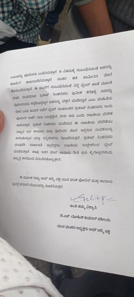 ಎಸಿಪಿ ಚಂದನ್ ಕುಮಾರ್ ಗೆ ಪ್ರತಾಪ್ ಸಿಂಹ ಟ್ವೀಟ್ ಹಿನ್ನೆಲೆ ನಾನು ಬರ್ತೇನೆ ನೀನು ಇರಬೇಕು ಅಂತ ಟ್ವೀಟ್ ಇದು ಸಂವಿಧಾನ ವಿರೋಧಿ ಹೇಳಿಕೆ ಕಾನೂನು ಸುವ್ಯವಸ್ಥೆ ಹಾಳಾಗುತ್ತೆ ಒಬ್ಬ ಸಂಸದರಾಗಿರದ್ದವರು ಈ ರೀತಿ ಮಾತನಾಡುವುದು ಶೋಭೆ ತರುವುದಲ್ಲ ಈ ಬಗ್ಗೆ ಡಿಸಿಪಿ ಗಿರೀಶ್ ಅವರಿಗೆ ದೂರು ನೀಡಲಾಗಿದೆ ಲೋಹಿತ್ ಕುಮಾರ್ ಯುವ ಘಟಕದ ಅಧ್ಯಕ್ಷ ಆಮ್ ಆದ್ಮಿ. ಈ ರೀತಿ ಮಾತನಾಡುವುದು ಧಮ್ಕಿ ಹಾಕಿದಂತೆ ಎಂದು ಪ್ರತಾಪ್ ಸಿಂಹ ವಿರುದ್ಧ ದೂರು ನೀಡಿದ ಲೋಹಿತ್