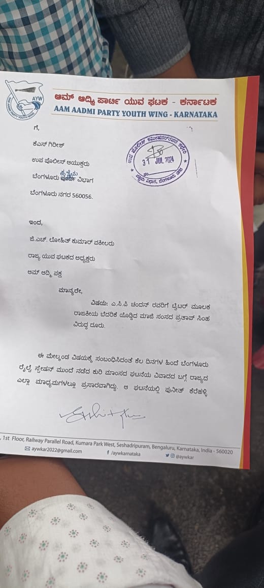 ಎಸಿಪಿ ಚಂದನ್ ಕುಮಾರ್ ಗೆ ಪ್ರತಾಪ್ ಸಿಂಹ ಟ್ವೀಟ್ ಹಿನ್ನೆಲೆ ನಾನು ಬರ್ತೇನೆ ನೀನು ಇರಬೇಕು ಅಂತ ಟ್ವೀಟ್ ಇದು ಸಂವಿಧಾನ ವಿರೋಧಿ ಹೇಳಿಕೆ ಕಾನೂನು ಸುವ್ಯವಸ್ಥೆ ಹಾಳಾಗುತ್ತೆ ಒಬ್ಬ ಸಂಸದರಾಗಿರದ್ದವರು ಈ ರೀತಿ ಮಾತನಾಡುವುದು ಶೋಭೆ ತರುವುದಲ್ಲ ಈ ಬಗ್ಗೆ ಡಿಸಿಪಿ ಗಿರೀಶ್ ಅವರಿಗೆ ದೂರು ನೀಡಲಾಗಿದೆ ಲೋಹಿತ್ ಕುಮಾರ್ ಯುವ ಘಟಕದ ಅಧ್ಯಕ್ಷ ಆಮ್ ಆದ್ಮಿ. ಈ ರೀತಿ ಮಾತನಾಡುವುದು ಧಮ್ಕಿ ಹಾಕಿದಂತೆ ಎಂದು ಪ್ರತಾಪ್ ಸಿಂಹ ವಿರುದ್ಧ ದೂರು ನೀಡಿದ ಲೋಹಿತ್
