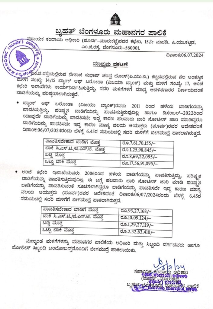 ಬ್ಯಾಂಕ್ ಆಫ್ ಬರೋಡಾ ಪಾಲಿಕೆಗೆ 17.56 ಕೋಟಿ ರೂ. ಬಾಡಿಗೆ ಪಾಲಿಕೆಗೆ ಪಾವತಿಸಬೇಕಿದ್ದು, ಈ ಸಂಬಂಧ ಪೂರ್ವ ವಲಯ ಆಯುಕ್ತರ ಆದೇಶದಂತೆ ಇಂದು ಬೆಳಗ್ಗೆ 6.45ರ ಸಮಯದಲ್ಲಿ ಸದರಿ ಮಳಿಗೆಗೆ ಬೀಗಮುದ್ರೆ ಹಾಕಲಾಗಿರುತ್ತದೆ.