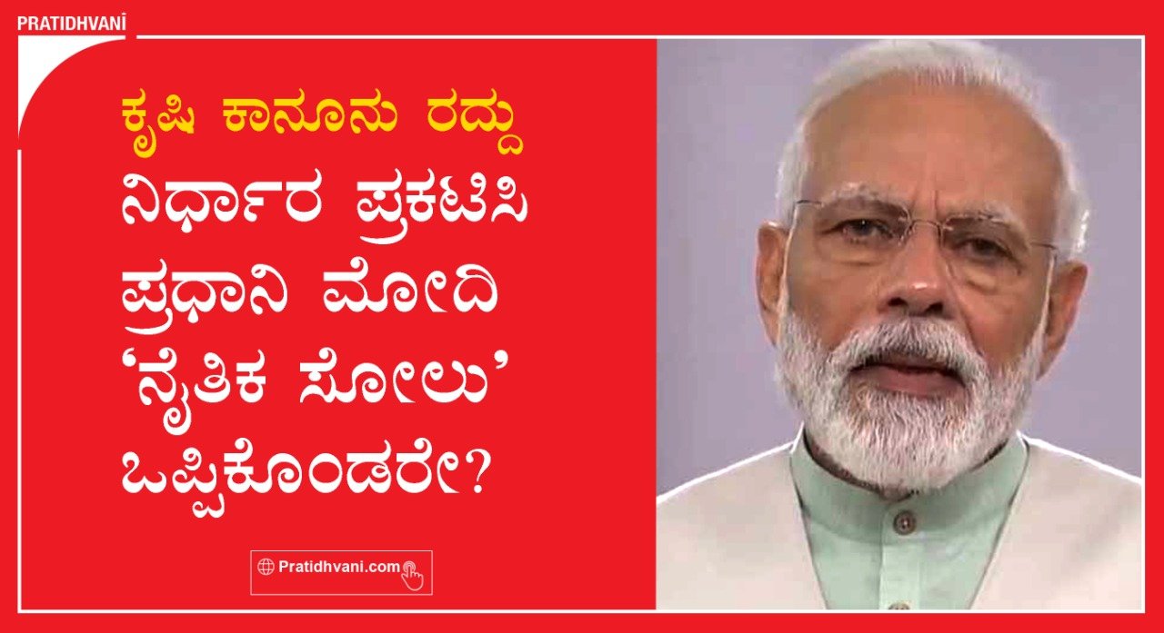 ವಿವಾದಾತ್ಮಕ ಮೂರು ಕೃಷಿ ಕಾನೂನುಗಳನ್ನು ರದ್ದು ಮಾಡುವುದಾಗಿ ಘೋಷಣೆ ಮಾಡುವ ಮೂಲಕ ಪ್ರಧಾನಿ ನರೇಂದ್ರ ಮೋದಿ ಸೋಲು ಒಪ್ಪಿಕೊಂಡರೆ? ಮೇಲ್ನೋಟಕ್ಕೆ ಇದನ್ನು ಮೋದಿಯವರ ರಾಜಕೀಯ ಜಾಣ್ಮೆ ನಡೆ ಎಂದು ವಿಶ್ಲೇಷಕರು ಅರ್ಥೈಸುತ್ತಿದ್ದಾರೆ. ವಾಸ್ತವವಾಗಿ ರೈತ ಸಮುದಾಯ ಮತ್ತು ಆಳುವವರ್ಗದ ನಡುವಿನ ಸಂಘರ್ಷದಲ್ಲಿ ರೈತ ಸಮುದಾಯಕ್ಕೆ ನೈತಿಕ ಜಯ ದಕ್ಕಿದೆ. ಸಹಜವಾಗಿಯೇ ಪ್ರಧಾನಿ ನರೇಂದ್ರ ಮೋದಿ ನೈತಿಕವಾಗಿ ಸೋಲು ಅನುಭವಿಸಿದ್ದಾರೆ.
