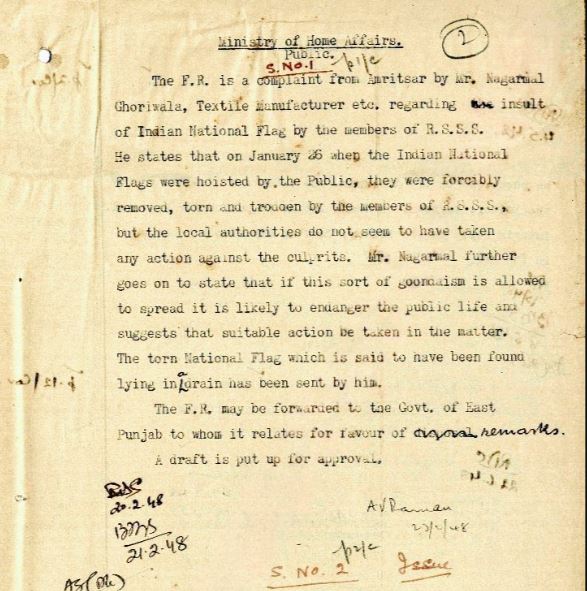ಭಾರತ ಸರ್ಕಾರದ ಗೃಹ ಸಚಿವಾಲಯವು ಪಂಜಾಬ್ ಮುಖ್ಯ ಕಾರ್ಯದರ್ಶಿಗೆ ಫೆಬ್ರವರಿ 24, 1948 ರಂದು ಬರೆದ ಪತ್ರ ಇಲ್ಲಿದೆ. ಇದರಲ್ಲಿ ಆರ್ಎಸ್ಎಸ್ (RSS Flag) ರಾಷ್ಟ್ರಧ್ವಜವನ್ನು ಹೇಗೆ ಅವಮಾನಿಸಿದೆ ಎಂಬುದನ್ನು ದಾಖಲಿಸಲಾಗಿದೆ.