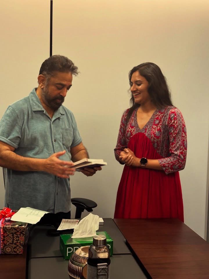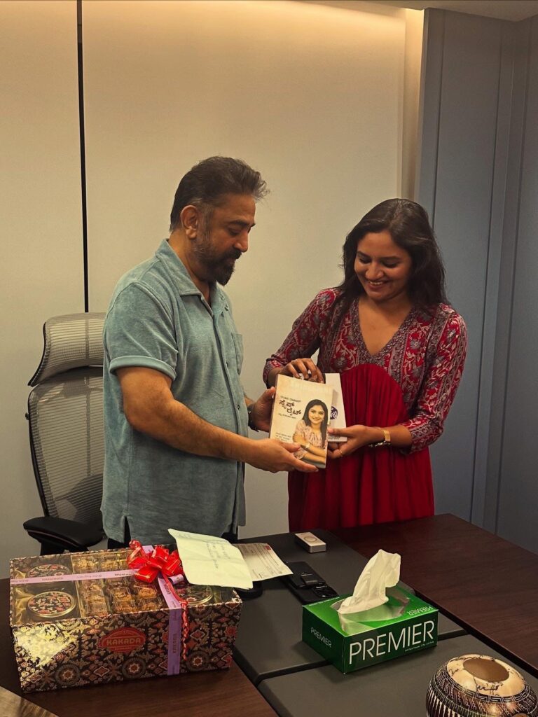 ಈ ಮಧ್ಯೆ ಕಿರುತೆರೆಯ ನಟಿ ಪುಟ ಗೌರಿ ಖ್ಯಾತಿಯ ರಂಜಿನಿ ರಾಘವನ್ (Ranjini raghavan) ನಟ ಕಮಲ್ ಹಾಸನ್ ರನ್ನು ಭೇಟಿಯಾಗಿದ್ದಾರೆ.ಇಷ್ಟೆಲ್ಲಾ ವಿವಾದದ ಮಧ್ಯೆ ನಟ ಕನಾಲ್ ಹಾಸನ್ ರನ್ನು ಭೇಟಿಯಾಗಿರುವ ರಂಜನಿ ರಾಘವನ್ ಕನಾಲ್ ಹಾಸನ್ ರಿಗೆ ಕನ್ನಡ ಪುಸ್ತಕಗಳನ್ನು ಉಡುಗೊರೆಯಾಗಿ ನೀಡಿದ್ದಾರೆ. ಇದು ಉಭಯ ರೀತಿಯ ಚರ್ಚೆಗೂ ದಾರಿ ಮಾಡಿಕೊಟ್ಟಿದೆ.