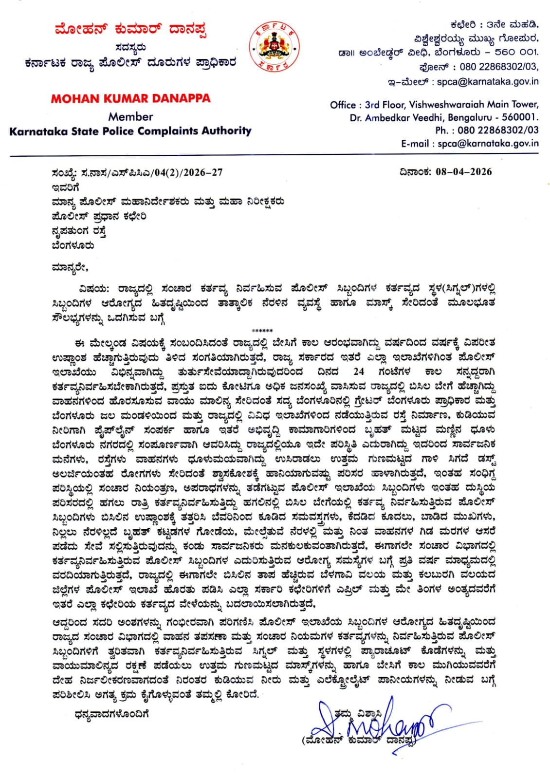 ರಾಜ್ಯದಲ್ಲಿ ಬೇಸಿಗೆ ತೀವ್ರಗೊಳ್ಳುತ್ತಿರುವ ಹಿನ್ನೆಲೆ, ಸಂಚಾರ ಪೊಲೀಸ್ ಸಿಬ್ಬಂದಿಗಳ ಆರೋಗ್ಯ ಹಿತದೃಷ್ಟಿಯಿಂದ ಅಗತ್ಯ ಮೂಲಸೌಕರ್ಯಗಳನ್ನು ಒದಗಿಸುವಂತೆ ಕರ್ನಾಟಕ ರಾಜ್ಯ ಪೊಲೀಸ್ ದೂರುಗಳ ಪ್ರಾಧಿಕಾರದ ಸದಸ್ಯ ಮೋಹನ್ ಕುಮಾರ್ ದಾನಪ್ಪ ಅವರು ರಾಜ್ಯದ ಡಿಜಿಪಿಗೆ ಪತ್ರ ಬರೆದಿದ್ದಾರೆ.