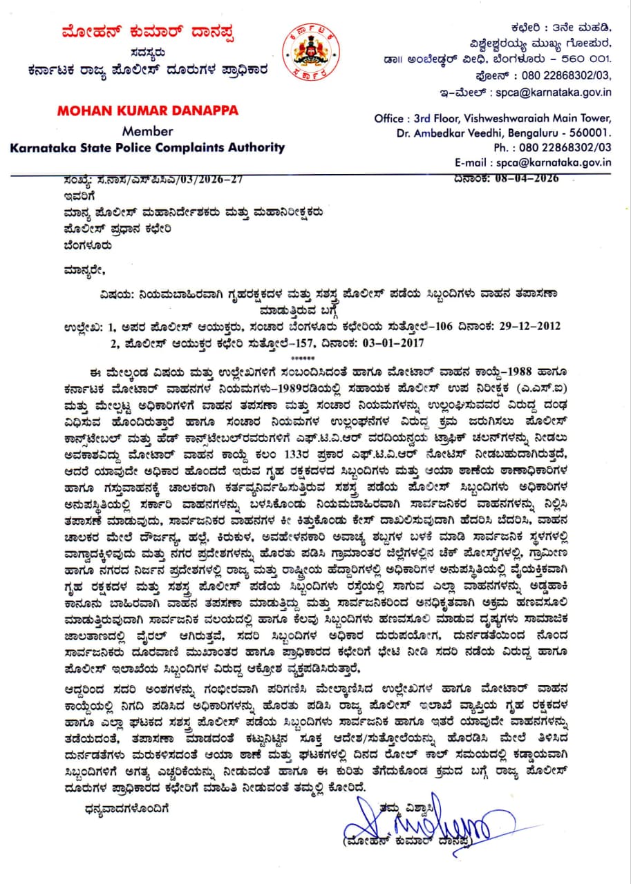 ರಾಜ್ಯದಲ್ಲಿ ಗೃಹ ರಕ್ಷಕದಳ ಹಾಗೂ ಸಶಸ್ತ್ರ ಪೊಲೀಸ್ ಸಿಬ್ಬಂದಿಗಳಿಂದ ನಡೆಯುತ್ತಿರುವ ನಿಯಮಬಾಹಿರ ವಾಹನ ತಪಾಸಣೆಗಳನ್ನು ತಕ್ಷಣ ನಿಲ್ಲಿಸುವಂತೆ ರಾಜ್ಯ ಪೊಲೀಸ್ ದೂರುಗಳ ಪ್ರಾಧಿಕಾರದ ಸದಸ್ಯ ಮೋಹನ್ ಕುಮಾರ್ ದಾನಪ್ಪ ಅವರು ಡಿಜಿ ಮತ್ತು ಐಜಿಪಿಗೆ ಪತ್ರ ಬರೆದು ಮನವಿ ಮಾಡಿದ್ದಾರೆ.ಮೋಟಾರ್ ವಾಹನ ಕಾಯ್ದೆ-1988 ಮತ್ತು ಕರ್ನಾಟಕ ಮೋಟಾರ್ ವಾಹನಗಳ ನಿಯಮಗಳು-1989ರ ಪ್ರಕಾರ, ಸಹಾಯಕ ಪೊಲೀಸ್ ಉಪ ನಿರೀಕ್ಷಕ (ಎಎಸ್ಐ) ಮತ್ತು ಅದಕ್ಕಿಂತ ಮೇಲಿನ ಅಧಿಕಾರಿಗಳಿಗೆ ಮಾತ್ರ ವಾಹನ ತಪಾಸಣೆ ನಡೆಸುವ ಹಾಗೂ ನಿಯಮ ಉಲ್ಲಂಘನೆಗೆ ದಂಡ ವಿಧಿಸುವ ಅಧಿಕಾರವಿದೆ.