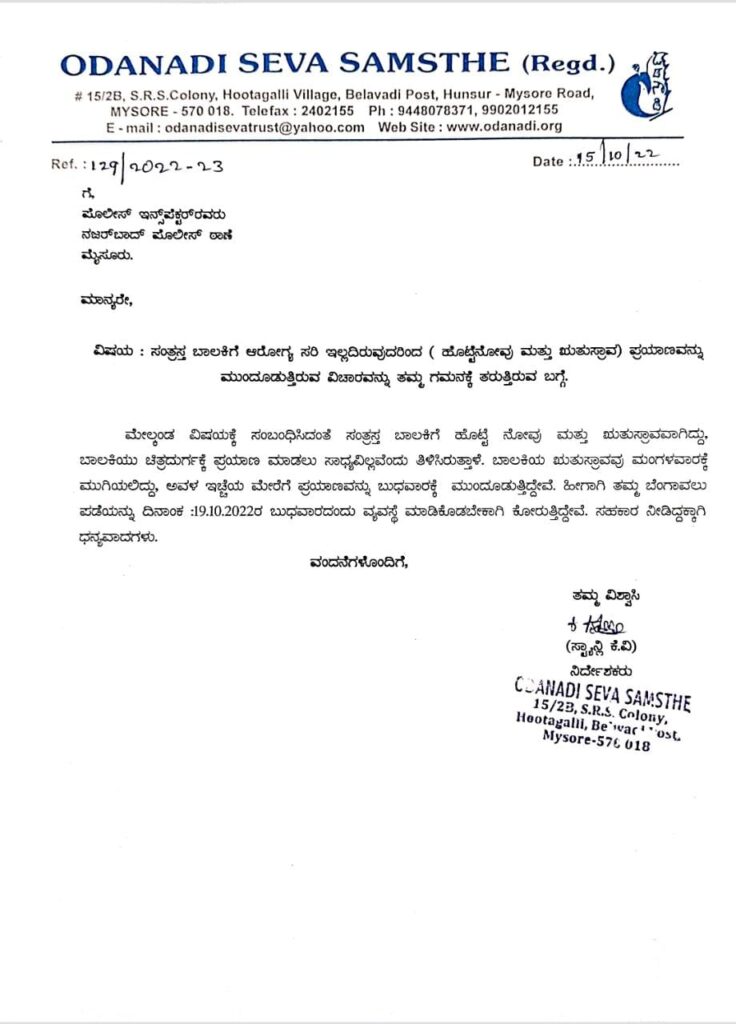 ಬಾಲಕಿಯರಿಗೆ ಎಸ್ಕಾರ್ಟ್ ಮೂಲಕ ಸೂಕ್ತ ಭದ್ರತೆ ನೀಡಬೇಕು ಮತ್ತು ಯಾವುದೇ ಅವಘಡ ಸಂಭವಿಸಿದಂತೆ ಮುಂಜಾಗ್ರತ ಕ್ರಮ ವಹಿಸುವಂತೆ ಒಡನಾಡಿ ಸಂಸ್ಥೆ ಬರೆದಿರುವ ಪತ್ರದಲ್ಲಿ ಮನವಿ ಮಾಡಲಾಗಿದೆ.