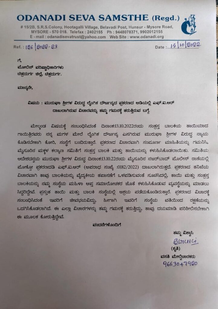 ಈ ಕುರಿತು ಮೈಸೂರು ನಜರಾಬಾದ್ ಪೊಲೀಸ್ ಠಾಣೆಯಲ್ಲಿ ದೂರು ದಾಖಲಾಗಿದ್ದು ಶ್ರೀಗಳ ವಿರುದ್ದ ಎರಡನೇ FIR ದಾಖಲಾಗಿದೆ. ಜಿಲ್ಲಾ ಮಕ್ಕಳ ಕಲ್ಯಾಣ ಸಮಿತಿಯ ಆದೇಶದ ಮೇರೆಗೆ FIR ದಾಖಲಿಸಲಾಗಿದೆ ಎಂದು ಪೊಲೀಸ್ ಅಧಿಕಾರಿಗಳು ತಿಳಿಸಿದ್ದಾರೆ.