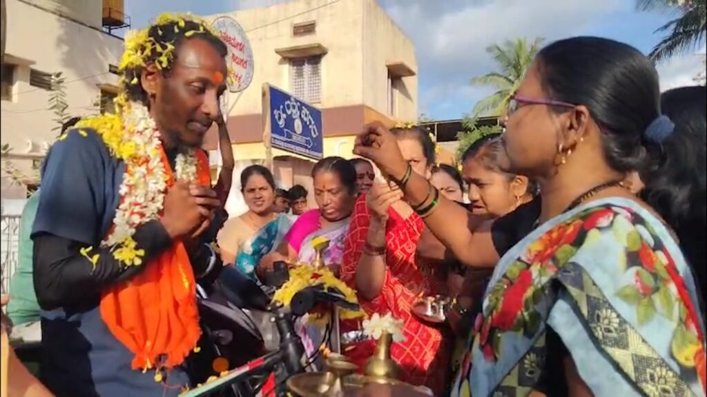 ಇನ್ನು ಯಾತ್ರೆ ಪೂರ್ಣಗೊಳಿಸಿ ಬಾಗಲಕೋಟೆ ನಗರದಕ್ಕೆ ಆಗಮಿಸಿದ ಯುವಕನಿಗೆ ಸ್ವಳೀಯರು ಆರತಿ ಬೆಳಗಿ ಸ್ವಾಗತಿಸಿದರು.
