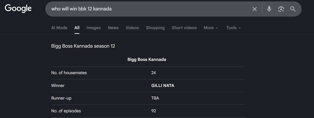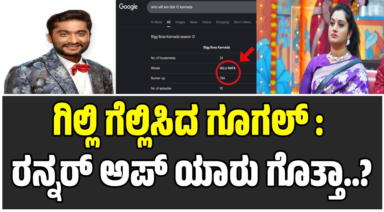 ಈ ನಡುವೆ ಜಾಗತಿಕ ಮಟ್ಟದ ದೈತ್ಯ ಸರ್ಚ್ ಇಂಜಿನ್ ಗೂಗಲ್ ಮಾತ್ರ ಈ ಬಾರಿ ಗಿಲ್ಲಿಯ ಗೆಲುವು ಪಕ್ಕಾ ಎಂದು ಹೇಳುತ್ತಿದೆ. 12 ಸೀಸನ್ನ ಬಿಗ್ ಬಾಸ್ ಸ್ಪರ್ಧೆಯ ವಿನ್ನರ್ ಯಾರಾಗಲಿದ್ದಾರೆ ಎಂದು ಸರ್ಚ್ ಮಾಡಿದಾಗ ಅದರಲ್ಲಿ ಗಿಲ್ಲಿ ಎಂದು ತೋರಿಸುತ್ತಿರುವುದು ಗಿಲ್ಲಿ ಅಭಿಮಾನಿಗಳಲ್ಲಿ ಸಾಕಷ್ಟು ಸಂತಸಕ್ಕೆ ಕಾರಣವಾಗಿದೆ.ಇ
