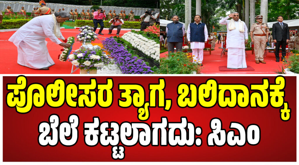 ಪೊಲೀಸ್ ಸಂಸ್ಮರಣಾ ದಿನಾಚರಣೆ ಕಾರ್ಯಕ್ರಮದಲ್ಲಿ ಹುತಾತ್ಮ ಪೊಲೀಸ್ ಅಧಿಕಾರಿ ಮತ್ತು ಸಿಬ್ಬಂದಿಗೆ ಸಂತಾಪ ಸಲ್ಲಿಸಿ ಮಾತನಾಡಿದ ಸಿಎಂ ಸಿದ್ದರಾಮಯ್ಯ, ಒಂದು ವರ್ಷದಲ್ಲಿ ರಾಜ್ಯದ 8 ಮಂದಿ ಸೇರಿ ದೇಶದಲ್ಲಿ 191 ಮಂದಿ ಕರ್ತವ್ಯ ನಿರ್ವಹಣೆ ವೇಳೆ ಪ್ರಾಣ ತ್ಯಾಗ ಮಾಡುವ ಹುತಾತ್ಮರಾಗಿದ್ದಾರೆ. ಇವರ ತ್ಯಾಗ, ಬಲಿದಾನಕ್ಕೆ ಬೆಲೆ ಕಟ್ಟಲಾಗದು. ಇವರನ್ನು ಇಡೀ ದೇಶ ಸ್ಮರಿಸಿ, ವಂದಿಸುವುದು ಪ್ರತಿಯೊಬ್ಬರ ಕರ್ತವ್ಯ ಎಂದರು.