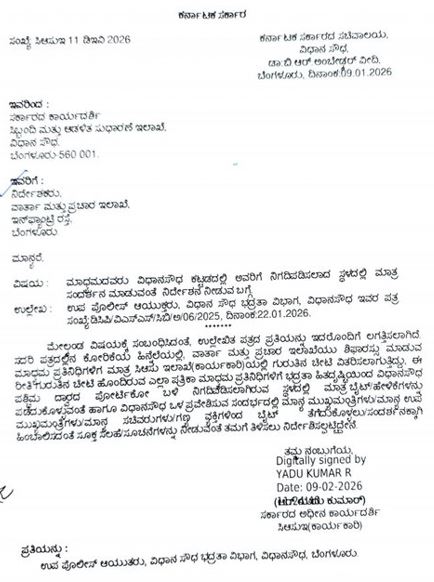 ಭದ್ರತಾ ನೆಪವೊಡ್ಡಿ ಮಾಧ್ಯಮಗಳು ವಿಧಾನಸೌಧದಲ್ಲಿ ಎಲ್ಲೆಂದರಲ್ಲಿ ಶಾಸಕ, ಸಚಿವರ ಪ್ರತಿಕ್ರಿಯೆ ಪಡೆಯುವಂತಿಲ್ಲ. ನಿರ್ಧಿಷ್ಟ ಸ್ಥಳದಲ್ಲಿ ಮಾತ್ರ ಮಾಧ್ಯಮಗಳು ಇರಬೇಕು ಎಂದು ಸರ್ಕಾರ ಸೂಚಿಸಿದ್ದು. ಮಾಧ್ಯಮಗಳ ಆಕ್ರೋಶಕ್ಕೆ ಕಾರಣವಾಗಿದೆ.