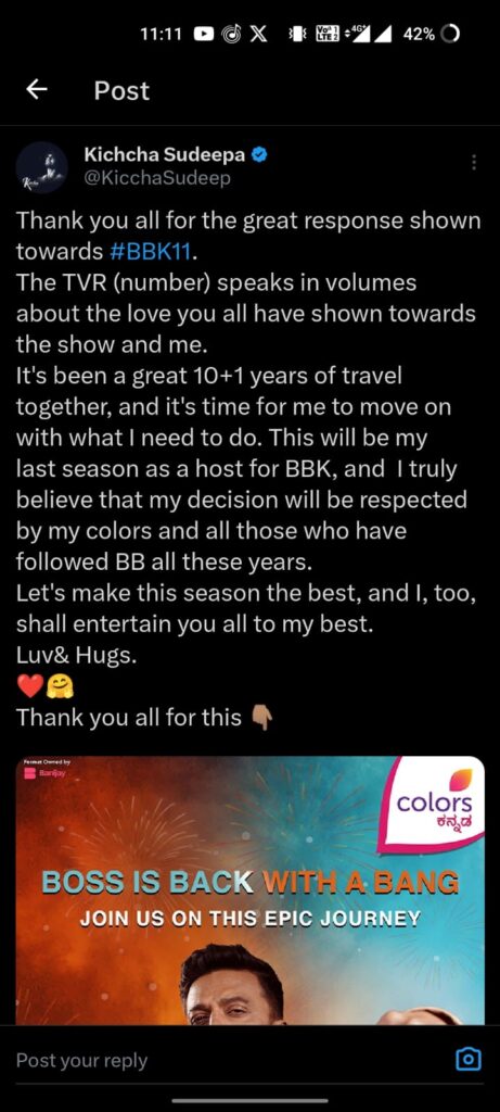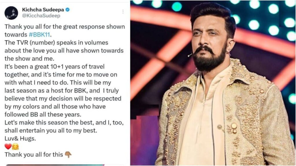 ಬಿಗ್ ಬಾಸ್ ಕನ್ನಡ 11 ಕಾರ್ಯಕ್ರಮಕ್ಕೆ ಅತ್ಯುತ್ತಮ ಪ್ರತಿಕ್ರಿಯೆ ನೀಡಿದ್ದಕ್ಕೆ ನಿಮಗೆಲ್ಲ ಧನ್ಯವಾಗಳು. ಸಿಕ್ಕಿರುವ ಟಿಆರ್ಪಿ ನೋಡಿದರೆ ನನ್ನ ಬಗ್ಗೆ ಮತ್ತು ಈ ಶೋ ಬಗ್ಗೆ ನೀವು ತೋರಿಸಿ ಪ್ರೀತಿ ಏನೆಂಬುದು ತಿಳಿಯುತ್ತದೆ. ಈ 10 ಪ್ಲಸ್ 1 ವರ್ಷ ನಿಮ್ಮೊಂದಿಗೆ ಪಯಣ ಮಾಡಿದ್ದು ಚೆನ್ನಾಗಿತ್ತು. ಈಗ ನಾನು ಬೇರೆ ಕಡೆಗೆ ಗಮನ ಹರಿಸುವ ಸಮಯ ಬಂದಿದೆ’ ಎಂದು ಸುದೀಪ್ ಅವರು ಹೇಳಿದ್ದಾರೆ.