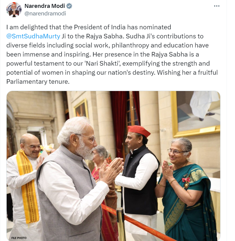 ಸಮಾಜಸೇವೆ, ಲೋಕೋಪಕಾರ ಮತ್ತು ಶಿಕ್ಷಣ ಸೇರಿದಂತೆ ವಿವಿಧ ಕ್ಷೇತ್ರಗಳಿಗೆ ಸುಧಾಮೂರ್ತಿ ಅವರ ಕೊಡುಗೆ ಅಪಾರ ಮತ್ತು ಸ್ಪೂರ್ತಿದಾಯಕವಾಗಿದೆ. ರಾಜ್ಯಸಭೆಯಲ್ಲಿ ಅವರ ಉಪಸ್ಥಿತಿಯು ನಮ್ಮ ‘ನಾರಿ ಶಕ್ತಿ’ಗೆ ಪ್ರಬಲವಾದ ಸಾಕ್ಷಿಯಾಗಿದೆ, ಇದು ನಮ್ಮ ರಾಷ್ಟ್ರದ ಭವಿಷ್ಯವನ್ನು ರೂಪಿಸುವಲ್ಲಿ ಮಹಿಳೆಯರ ಶಕ್ತಿ ಮತ್ತು ಸಾಮರ್ಥ್ಯವನ್ನು ಉದಾಹರಿಸುತ್ತದೆ ಎಂದು ನರೇಂದ್ರ ಮೋದಿ ಅವರು ಟ್ವೀಟ್ ಮಾಡಿ ಮಾಹಿತಿ ಹಂಚಿಕೊಂಡಿದ್ದಾರೆ.