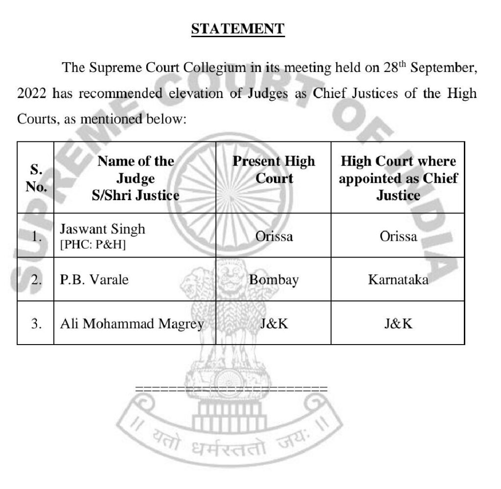 ಒರಿಶಾ ಹೈಕೋರ್ಟ್ನ ಮುಖ್ಯ ನ್ಯಾಯಮೂರ್ತಿಯಾಗಿ ಜಸ್ವಂತ್ ಸಿಂಗ್, ಮತ್ತು ಜಮ್ಮು ಮತ್ತು ಕಾಶ್ಮೀರ ಹೈಕೋರ್ಟ್ನ ಮುಖ್ಯ ನ್ಯಾಯಮೂರ್ತಿಯಾಗಿ ನ್ಯಾಯಮೂರ್ತಿ ಎ.ಎಂ.ಮ್ಯಾಗ್ರೆ ಅವರನ್ನು ನೇಮಿಸುವಂತೆ ಶಿಫಾರಸ್ಸು ಮಾಡಲಾಗಿದೆ.