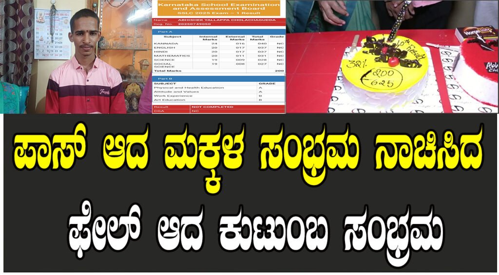 ಅಭಿಷೇಕ್ ಯಲ್ಲಪ್ಪ ಚೊಳಚಗುಡ್ಡ ಎಸ್ಎಸ್ಎಲ್ಸಿ ಫೇಲಾದ ವಿದ್ಯಾರ್ಥಿ ಆಗಿದ್ದು, 625 ಅಂಕಗಳಿಗೆ 200 ಅಂಕ ಪಡೆದು ಶೇಕಡ 32ರಷ್ಟು ಅಂಕ ಸಾಧನೆ ಮಾಡಿದ್ದಾನೆ. ಆರಕ್ಕೆ ಆರು ವಿಷಯಗಳಲ್ಲಿ ಅನುತ್ತೀರ್ಣನಾದ ಮಗನಿಗೆ ಕೇಕ್ ಕತ್ತರಿಸಿ ಸಂಭ್ರಮಿಸಿದ್ದಾರೆ. ಈ ಮೂಲಕ ಆತ್ಮಸ್ಥೈರ್ಯ ತುಂಬುವ ಕೆಲಸ ಮಾಡಿದ್ದಾರೆ.