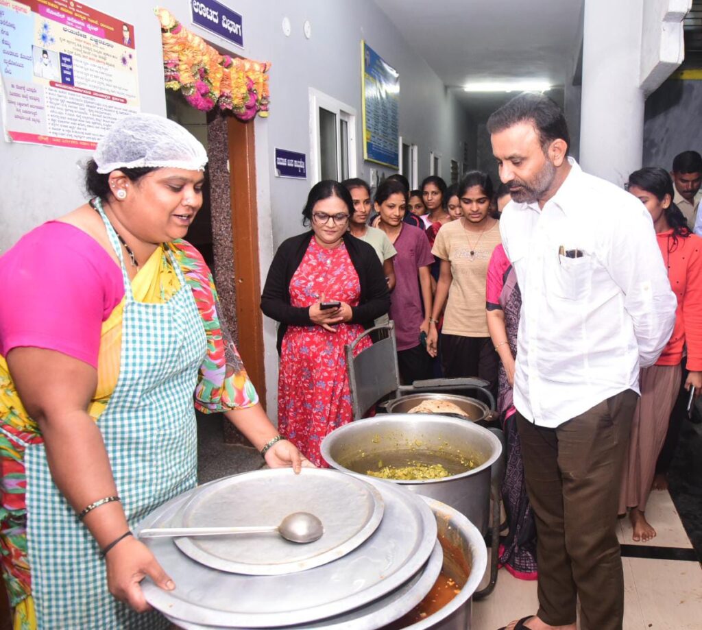 ಧಾರವಾಡ, ಕಾರ್ಮಿಕ ಹಾಗೂ ಧಾರವಾಡ ಜಿಲ್ಲಾ ಉಸ್ತುವಾರಿ ಸಚಿವ ಸಂತೋಷ ಲಾಡ್ (Santosh Lad)ಧಾರವಾಡ ನಗರದ ಸೈದಾಪುರದಲ್ಲಿರುವ ಸಮಾಜ ಕಲ್ಯಾಣ ಇಲಾಖೆಯ ಮೆಟ್ರಕ್ ನಂತರದ ವಿದ್ಯಾರ್ಥಿನಿಯರ ವಸತಿ ನಿಲಯಕ್ಕೆ ಅನಿರೀಕ್ಷಿತ ಭೇಟಿ ನೀಡಿ, ವಿದ್ಯಾರ್ಥಿನಿಯರ ಊಟ, ಗ್ರಂಥಾಲಯ, ಓದುವ ಕೊಠಡಿ ಸೇರಿದಂತೆ ವಿವಿಧ ಮೂಲಸೌಕರ್ಯಗಳನ್ನು ಪರಿಶೀಲಿಸಿದರು.ಜಿಲ್ಲಾಧಿಕಾರಿ ದಿವ್ಯ ಪ್ರಭು ಅವರೊಂದಿಗೆ ವಿದ್ಯಾರ್ಥಿನಿಯರ ವಸತಿನಿಲಯಕ್ಕೆ ಆಗಮಿಸಿದ ಸಚಿವರು, ನೇರವಾಗಿ ಅಡುಗೆ ಕೊಣೆಗೆ ಭೇಟಿ ನೀಡಿ, ಆಹಾರ ತಯಾರಿಕೆ, ಅಡುಗೆ ಪದಾರ್ಥ, ಸ್ವಚ್ಛತೆ, ನೈರ್ಮಲ್ಯ ಪರಿಶೀಲಿಸಿ, ಅಡುಗೆ ಪದಾರ್ಥಗಳ ಗುಣಮಟ್ಟ, ರುಚಿ ನೋಡಿದರು.