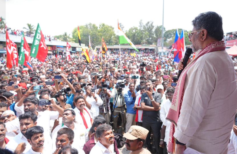 ನಾವು ನೀವೆಲ್ಲರೂ ಒಂದೇ ಮನೆಯವರು ಕೇವಲ ಒಂದು ಗೋಡೆ ಅಂತರವಿದೆ. ಬಿಜೆಪಿಯವರು ಏನಿದ್ದರೂ ಸಮಾಜ ಒಡೆಯುವ ಕತ್ತರಿ ಇದ್ದಂತೆ, ನಾವು ಸೂಜಿಯಂತೆ ಎಲ್ಲರನ್ನು ಸೇರಿಸುತ್ತೇವೆ. ರಾಮಚಂದ್ರ ಅವರು ನಿಮ್ಮ ಬಳಿ ಲಂಚ ಪಡೆದಿದ್ದಾರಾ? ಮೋಸ ಮಾಡಿದ್ದಾರಾ? ಇಲ್ಲ. ಸರಳ ನಾಯಕತ್ವದಲ್ಲಿ ನಿಮಗಾಗಿ ಅವರು ಶ್ರಮಿಸುತ್ತಿದ್ದಾರೆ. ಕಾಂಗ್ರೆಸ್, ಡಿಎಂಕೆ, ಕಮ್ಯುನಿಷ್ಟ್ ಸೇರಿದಂತೆ ಇಂಡಿಯಾ ಮೈತ್ರಿಕೂಟದ 20 ಪಕ್ಷಗಳ ಶಕ್ತಿ ರಾಮಚಂದ್ರ ಅವರ ಪರವಾಗಿದೆ. ಅವರ ಗೆಲುವು ನಿಮ್ಮ ಗೆಲುವು, ಅವರ ಶ್ರಮ ನಿಮಗೆ ಫಲ ಎಂದು ಇಂಡಿಯಾ ಕೂಟದ ಅಭ್ಯರ್ಥಿ ರಾಮಚಂದ್ರ ಪರ ಮತಯಾಚನೆ ಮಾಡಿದ್ದಾರೆ.